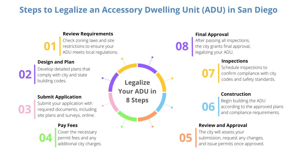 Begin by evaluating your property’s potential. To determine feasibility, check your lot size, zoning restrictions, and available utilities. Research San Diego’s local ADU regulations, especially for multifamily and coastal properties.