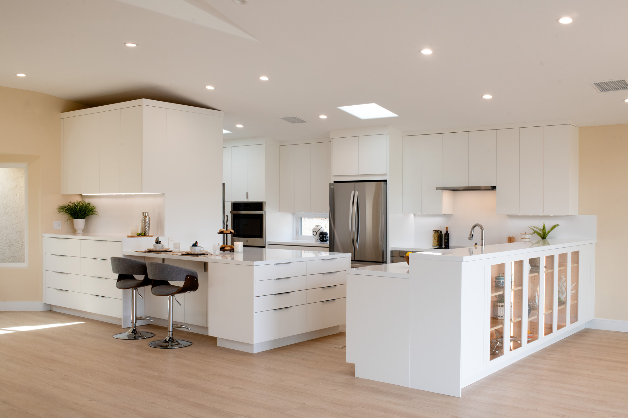 Timeless white kitchen remodel in San Diego with warm wood floors and classic cabinetry by Kaminskiy Design and Remodeling