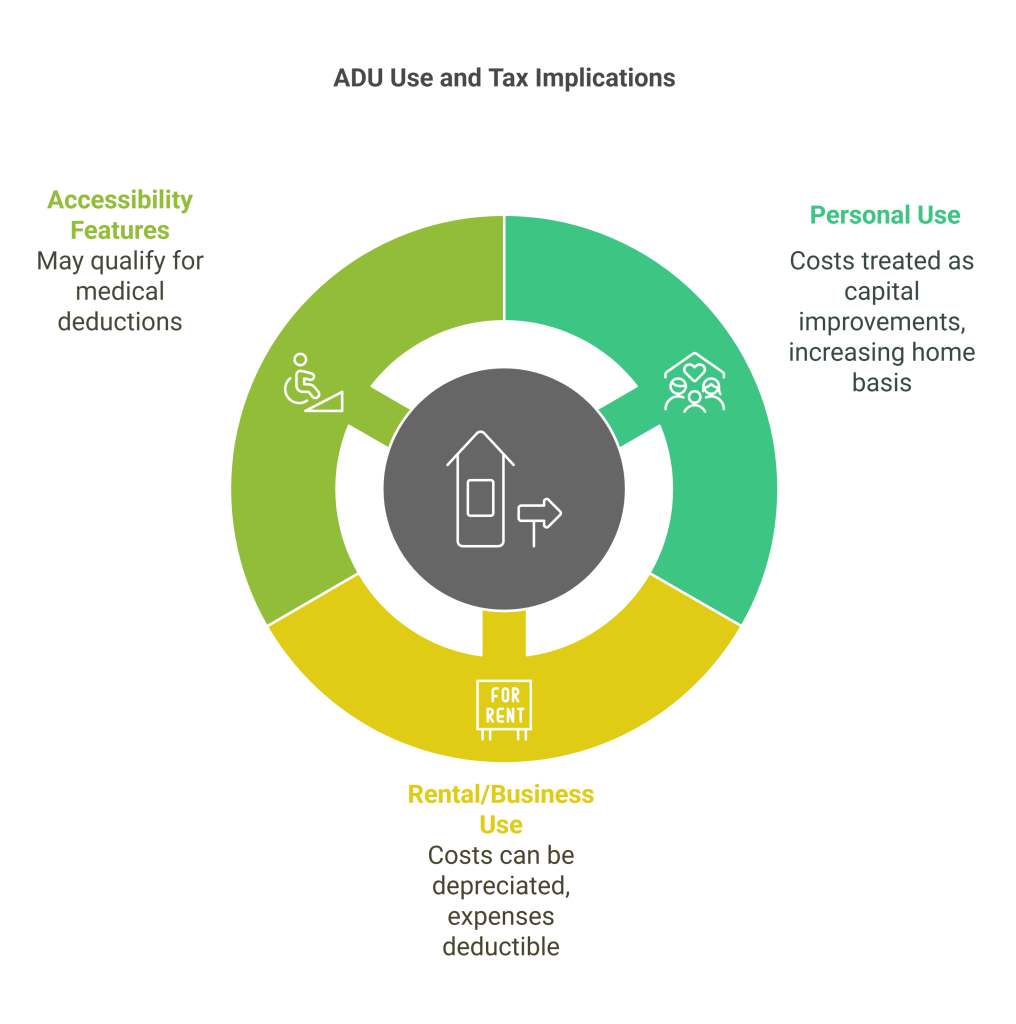 It depends on how the ADU is used. If the ADU is for personal use, the cost is not deductible but increases the cost basis, which can lower capital gains tax when selling. If the ADU is used for rental or business purposes, you may be able to depreciate the ADU over time and deduct operating expenses.