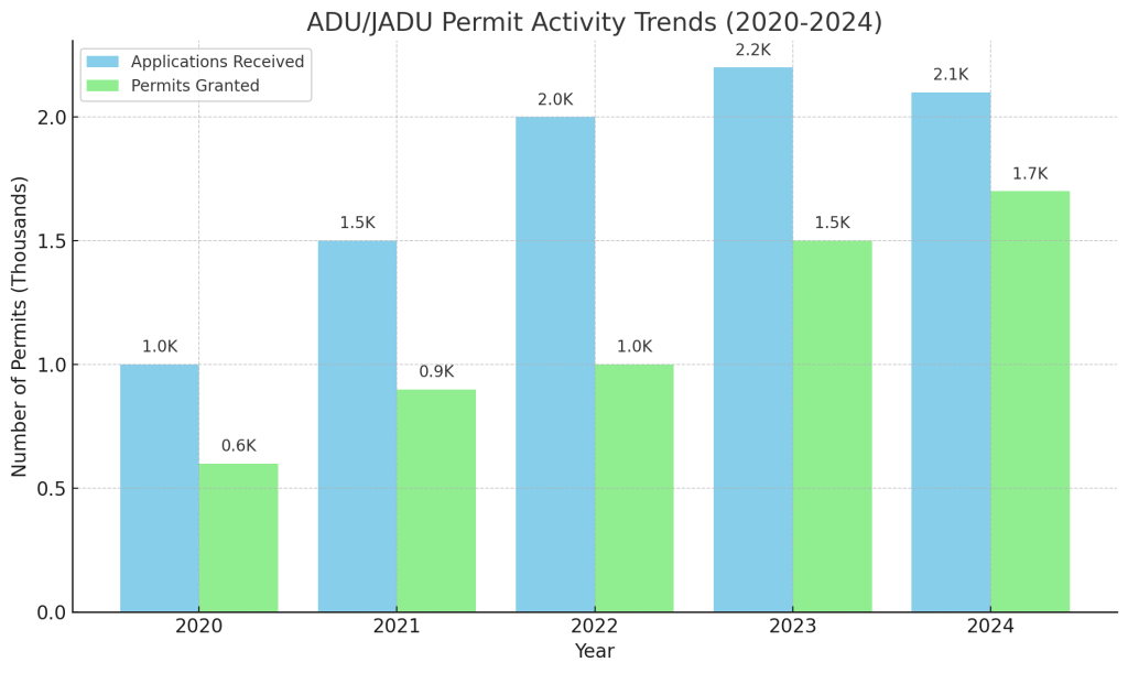 What’s particularly interesting in the 2023-2024 data is the slight decrease in applications (from 2.2K to 2.1K) while permit approvals continued to rise (from 1.5K to 1.7K). This suggests that while the initial ADU boom might stabilize, the city’s processing efficiency continues improving, which is excellent news for homeowners considering an ADU project.