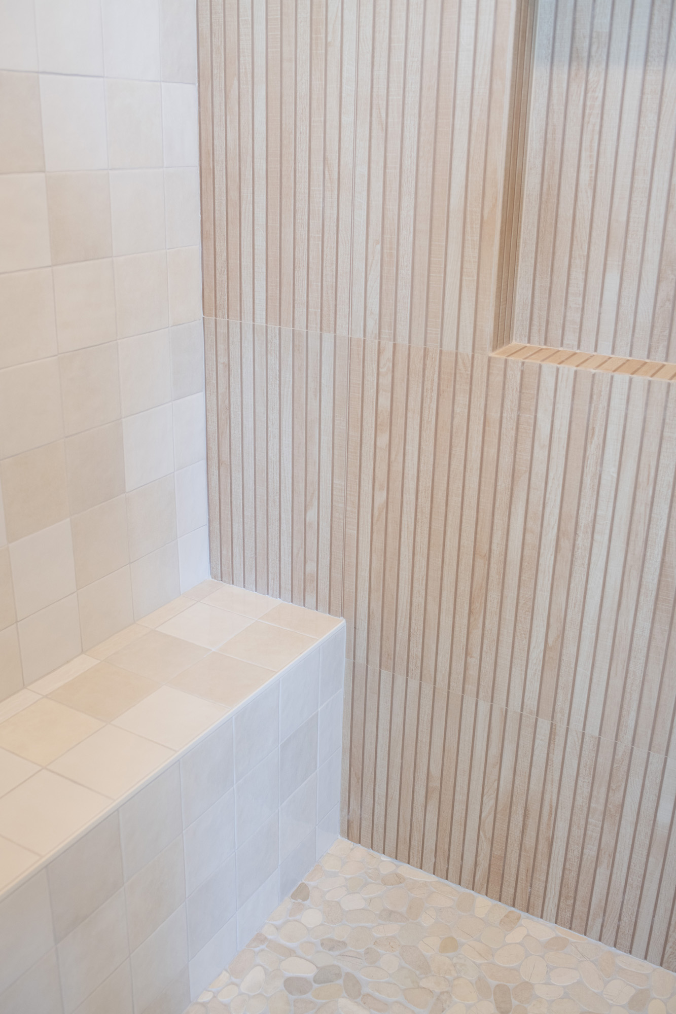 Tile & Stone: Bedrosians® porcelain floor paired with a sliced-pebble shower pan, Japandi slat accent wall, and glossy neutral field tiles. The trio layers warm texture and subtle movement, turning every surface into a calming focal point while keeping upkeep effortless.
