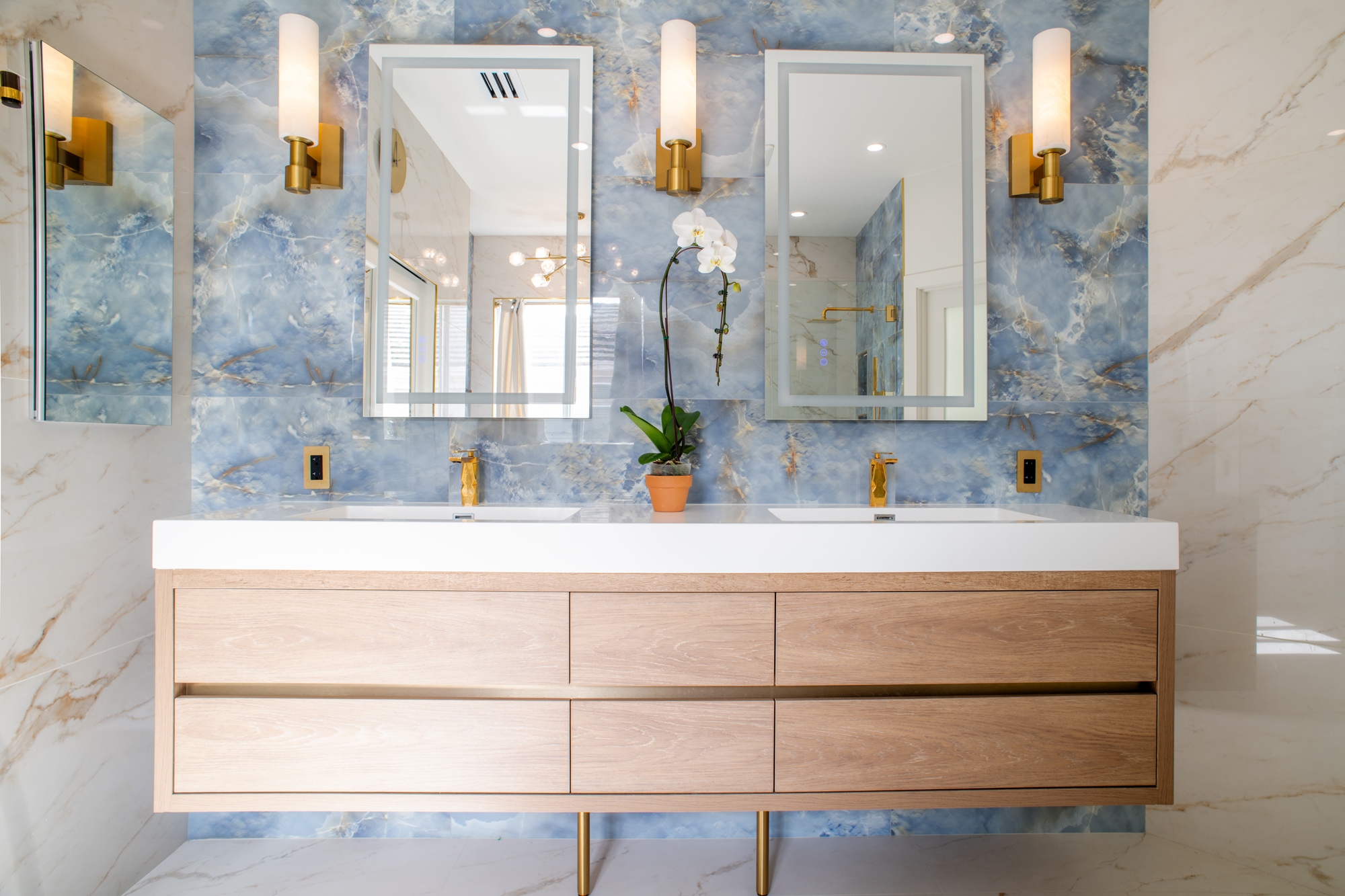 Step inside the details: statement tile walls, a sculptural soaking tub, floating blonde-oak cabinetry, and the refined contrast of polished finishes that make this Chula Vista bathroom feel like a high-end spa.