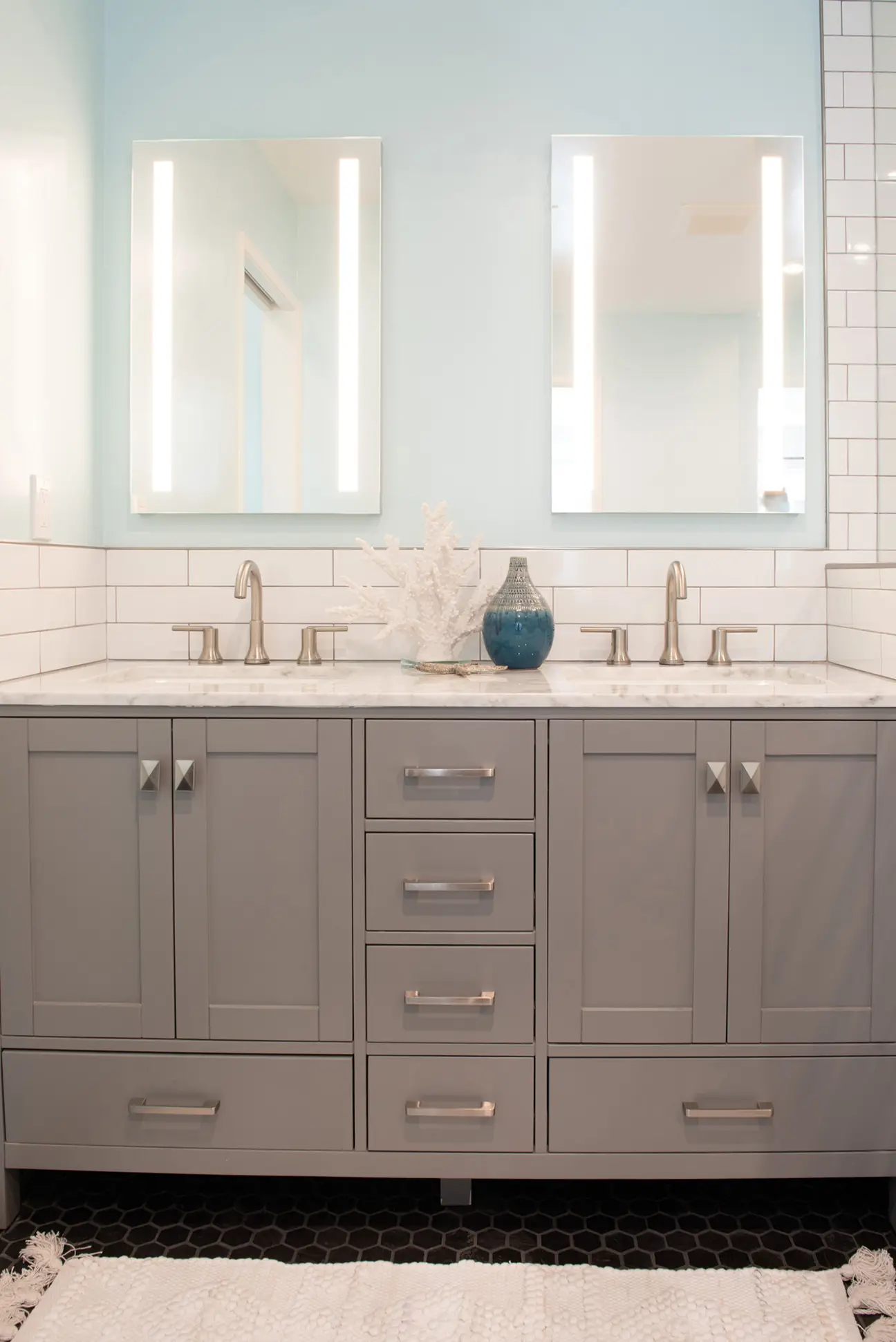 As you browse through the images, you’ll notice the careful attention to detail in every aspect of the remodel. The bathroom features a spacious layout, with ample room for a large vanity, a walk-in shower, and a freestanding bathtub. With its sleek lines and modern fixtures, the vanity offers plenty of storage space, while the large mirror enhances the sense of space and light.