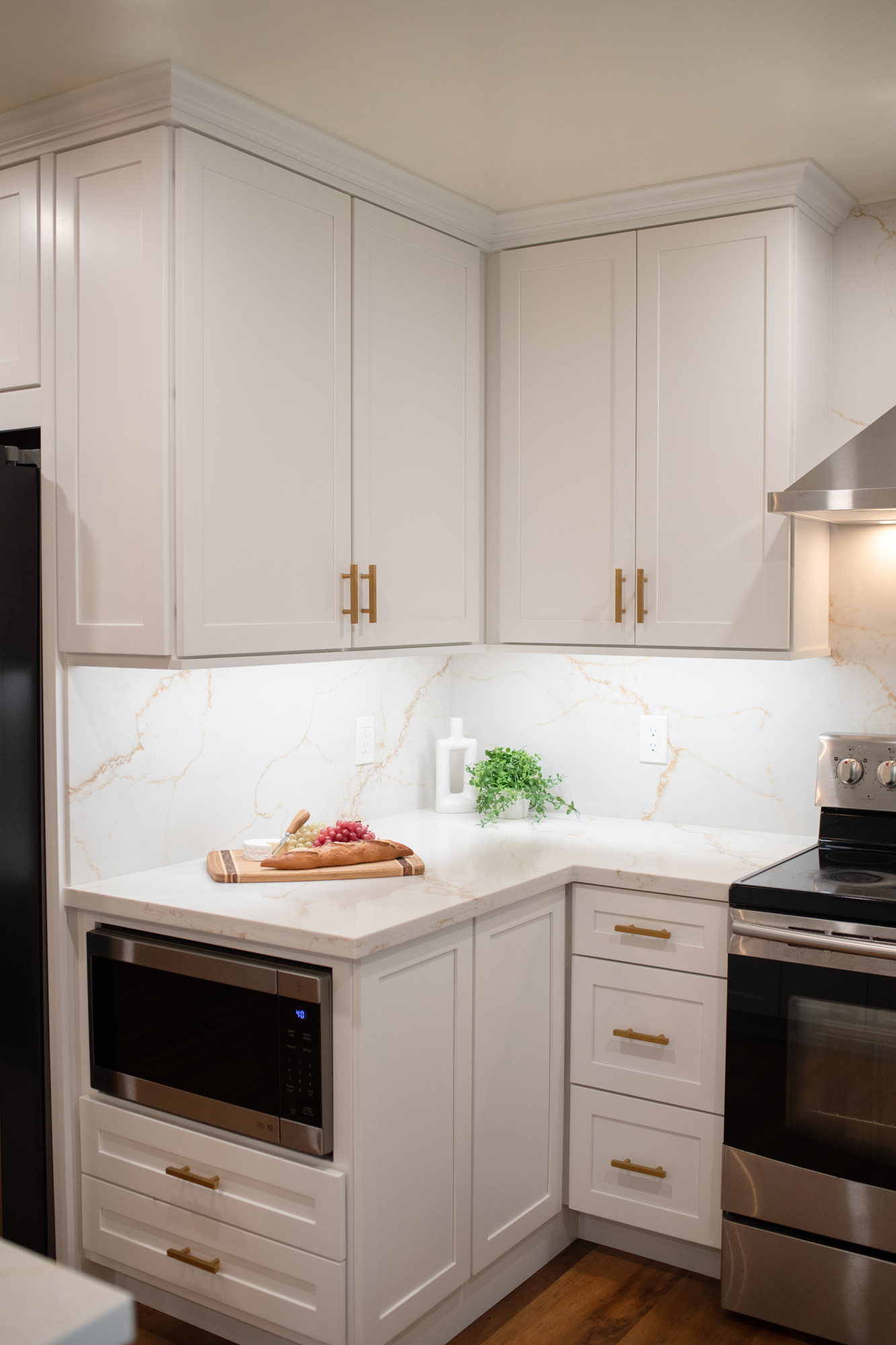 Immerse yourself in the visual journey of the project with our curated selection of high-resolution images. Each image reflects a possible adaptation for various San Diego home styles, showcasing how our designs can transform your unique space. Every detail accentuates the kitchen’s luxurious yet functional design, from the Mantra Omni Snow cabinets to the Calacatta Gold Quartz countertops.