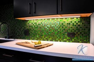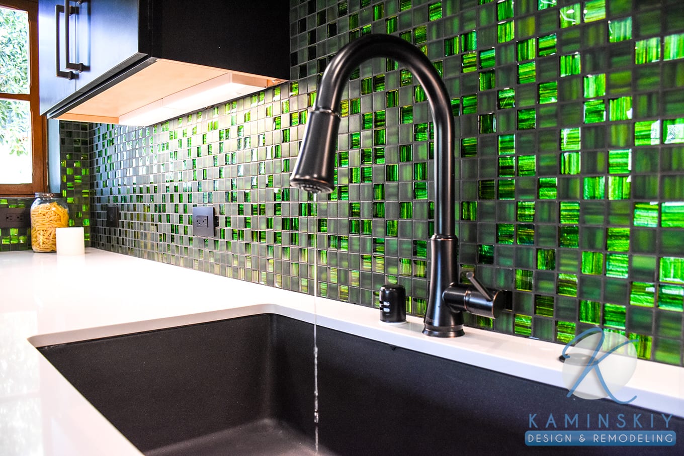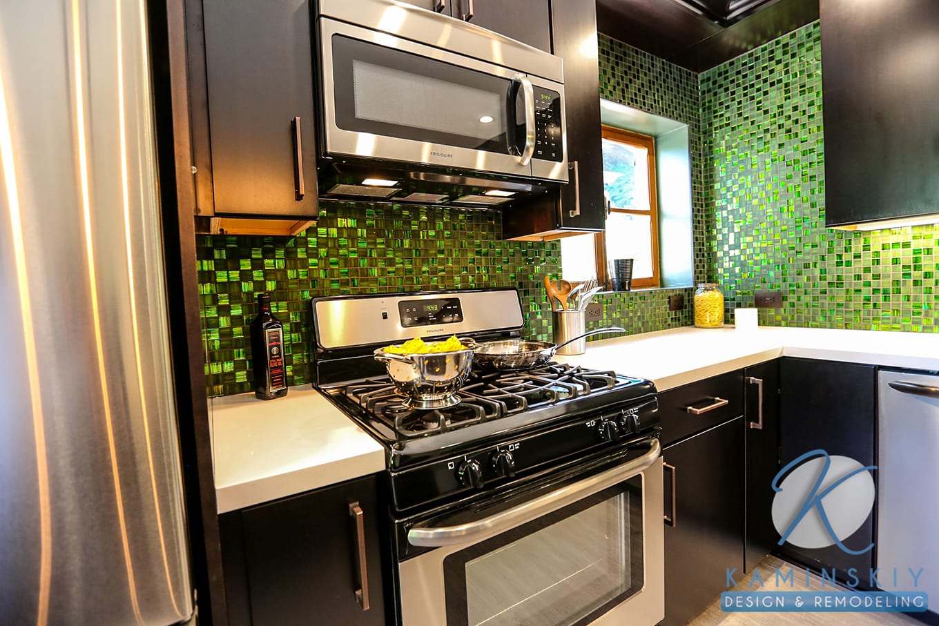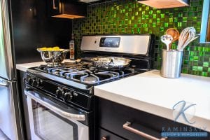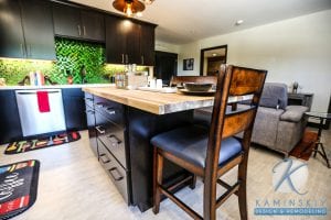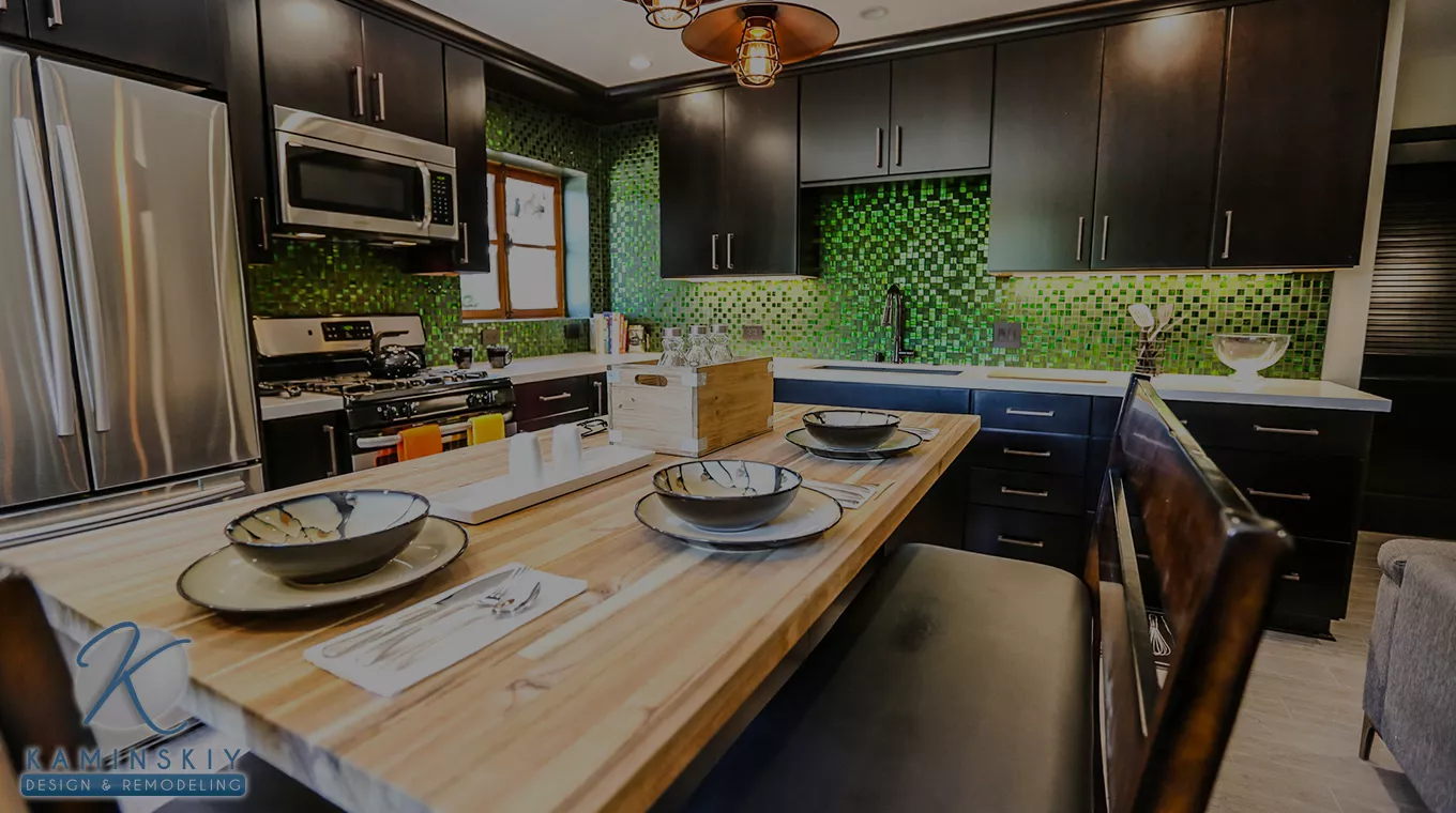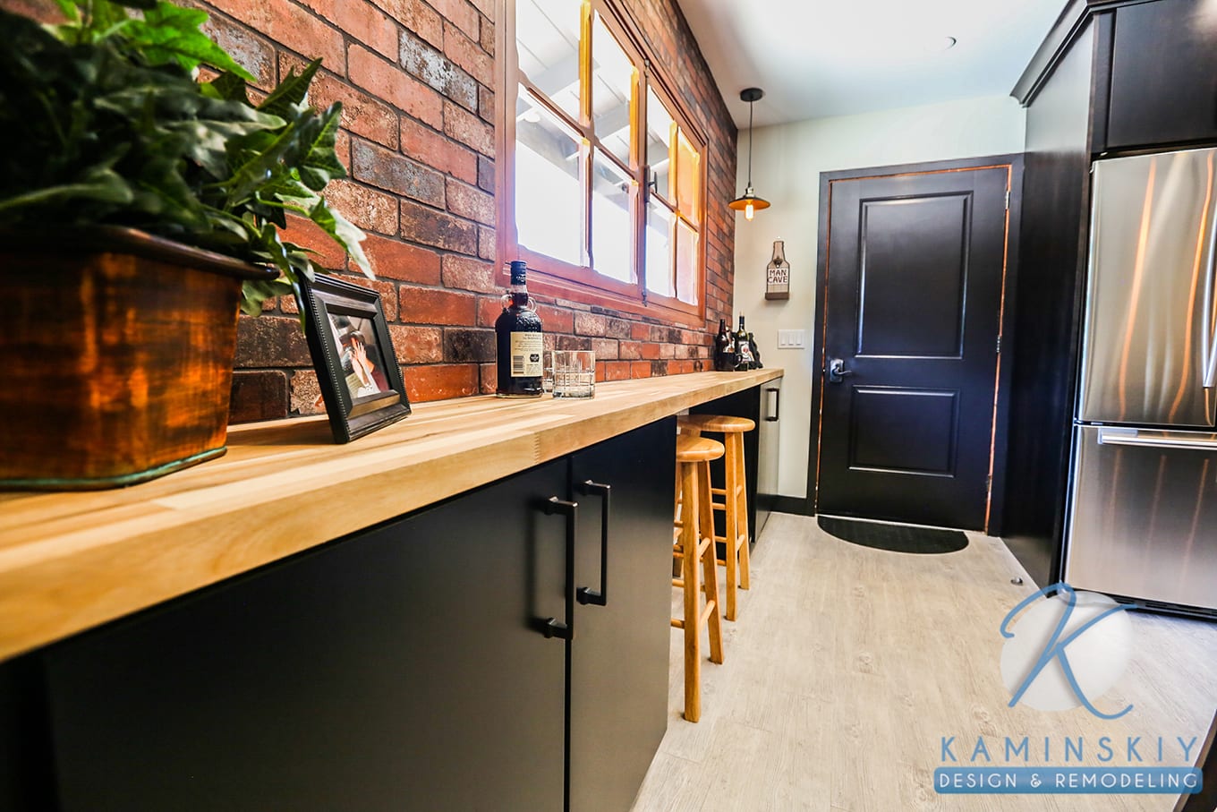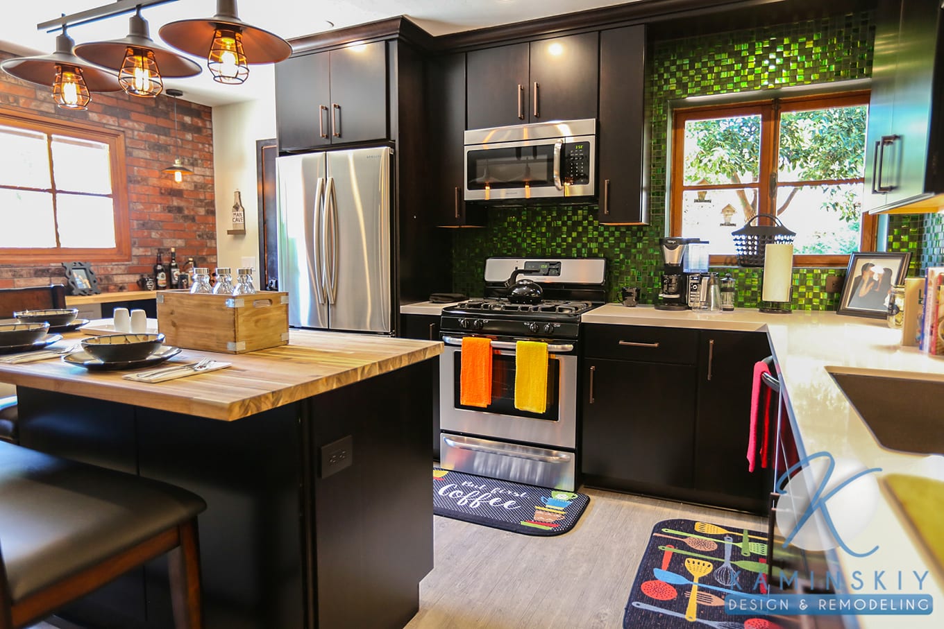 A brick accent wall is featured on the opposite side, providing a neutral contrast to the bright green backsplash. These colors are reminiscent of a pub atmosphere, especially with the industrial-style pendant lighting and dark finishes. An island also offers a small seating area for any guests or tenants. The butcher block completes the look of the space.