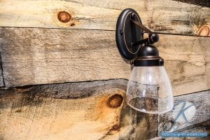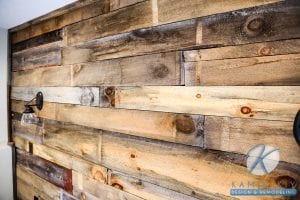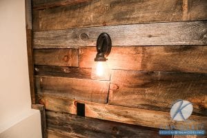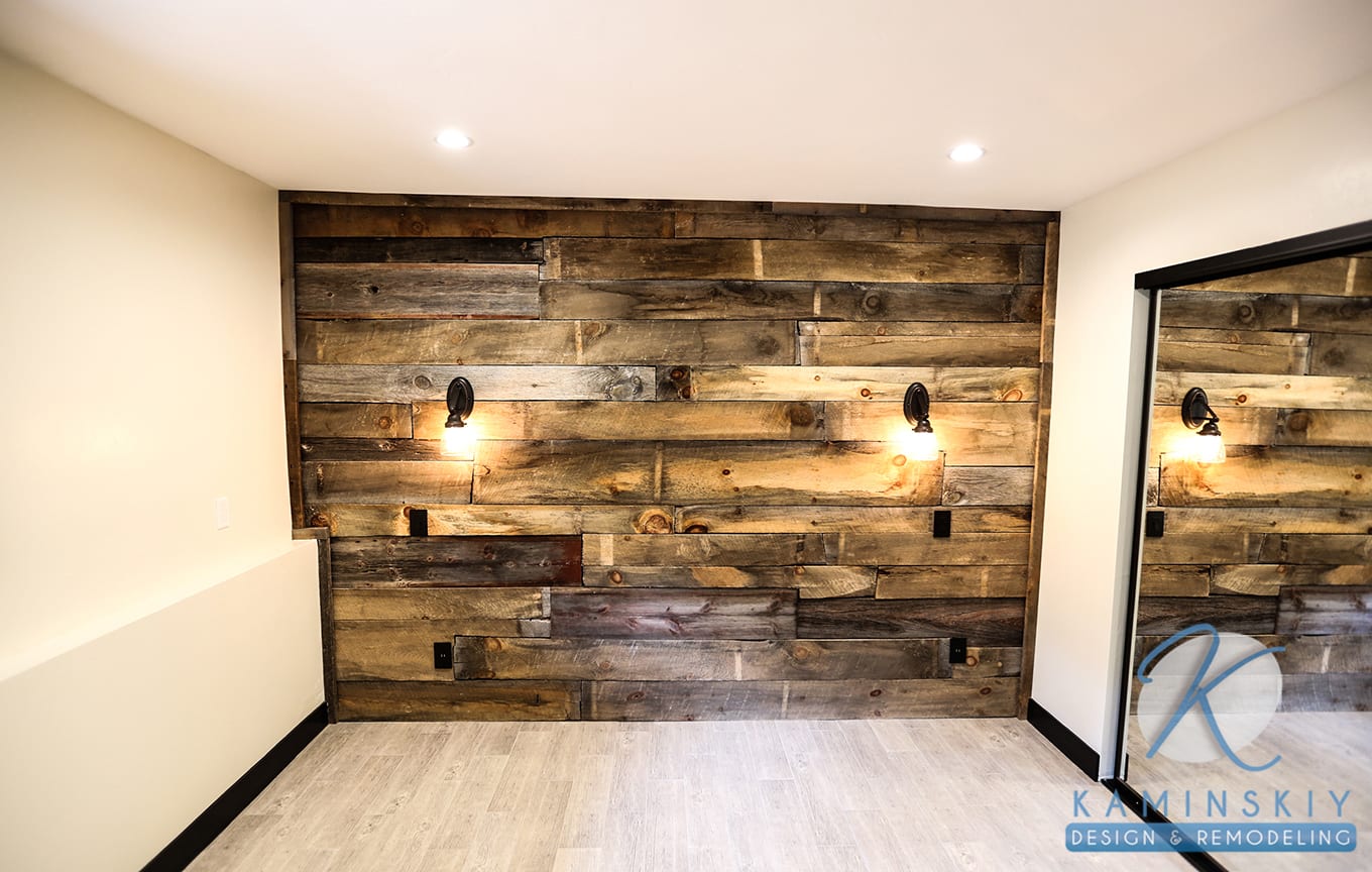 Though not furnished, the bedroom features ample room for a bed and anything else a tenant might need. The far wall is covered in reclaimed wood, adding a rustic feel to the space. It also adds visual interest to an otherwise plain space. A mirrored closet helps reflect light to make the room feel larger and hides a large closet.