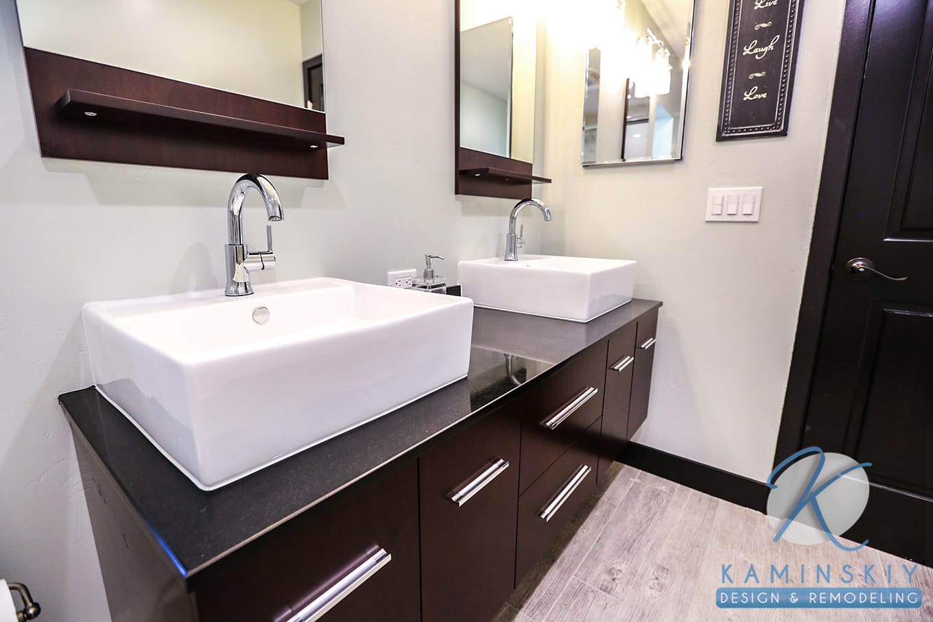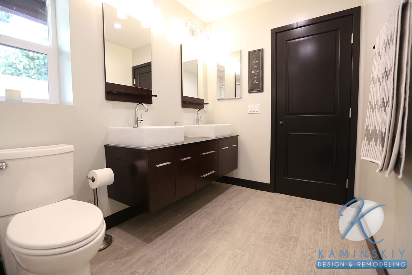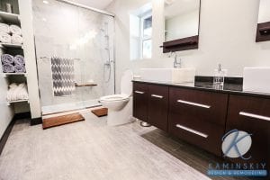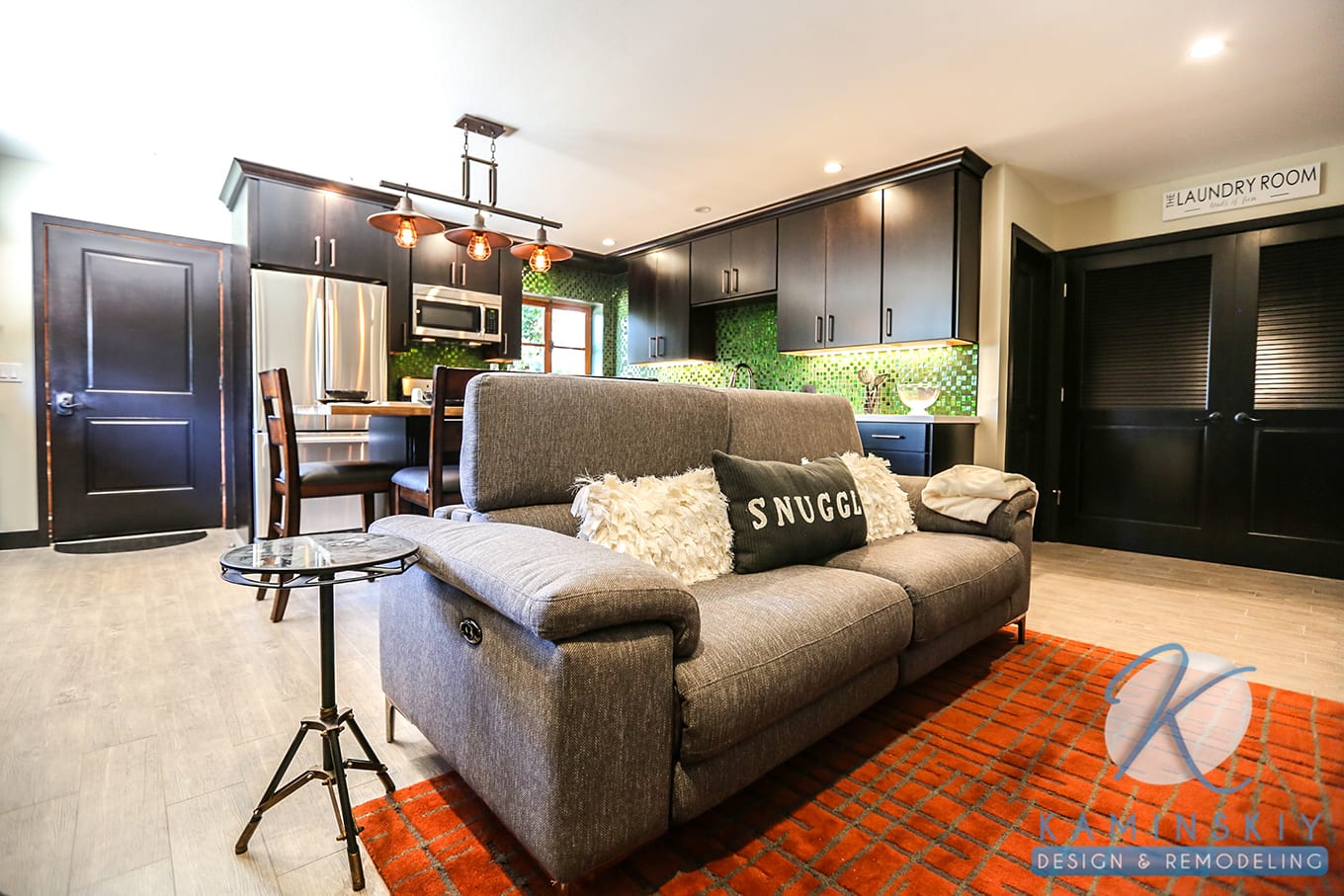 For this garage conversion, the owners wanted something refined, luxurious, and appealing to a wide variety of people. They opted for a light wood floor that would help reflect the light from the windows and be easy to clean. Meanwhile, the surrounding storage and kitchen cabinetry are a dark, almost black wood that brings in an air of sophistication.
