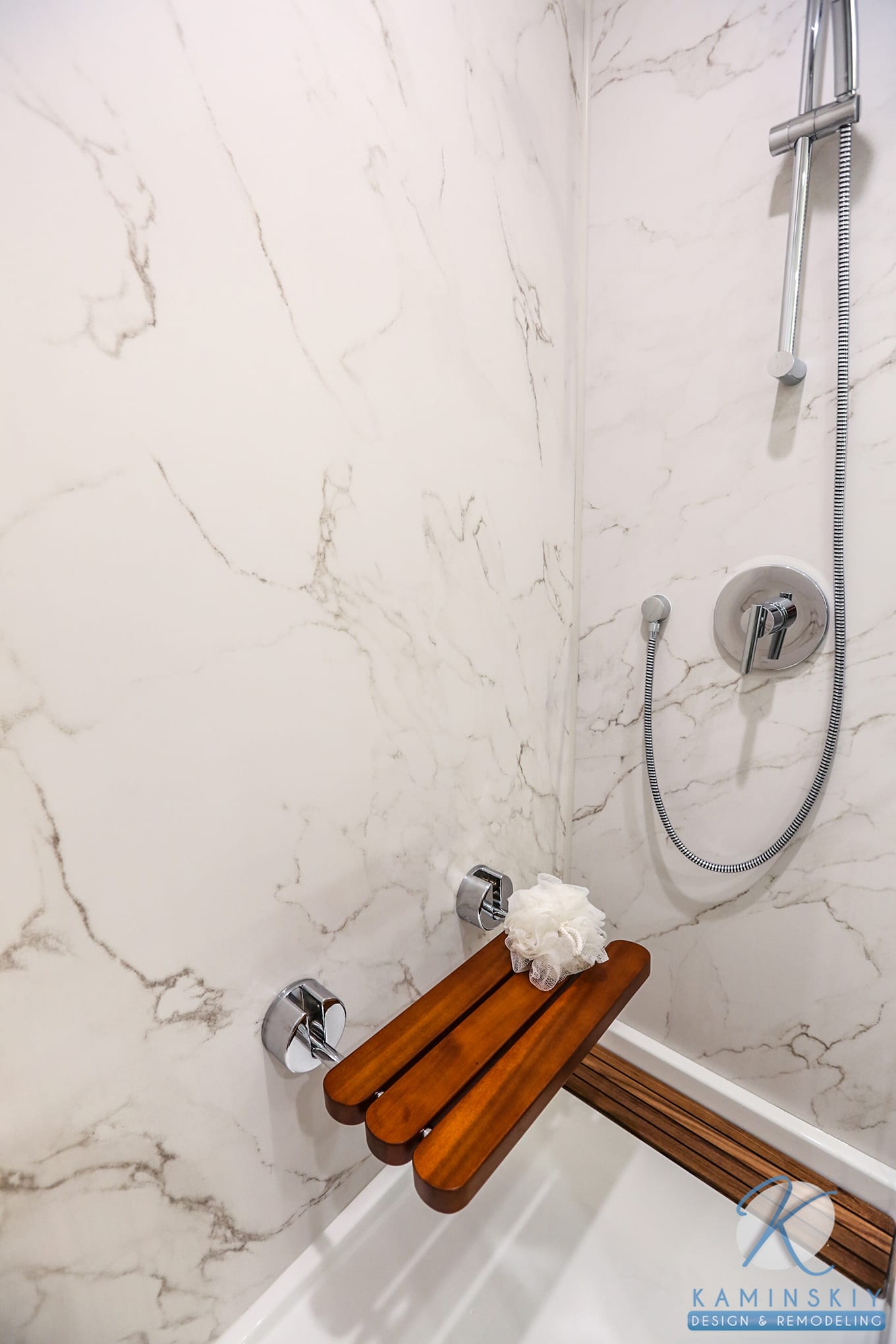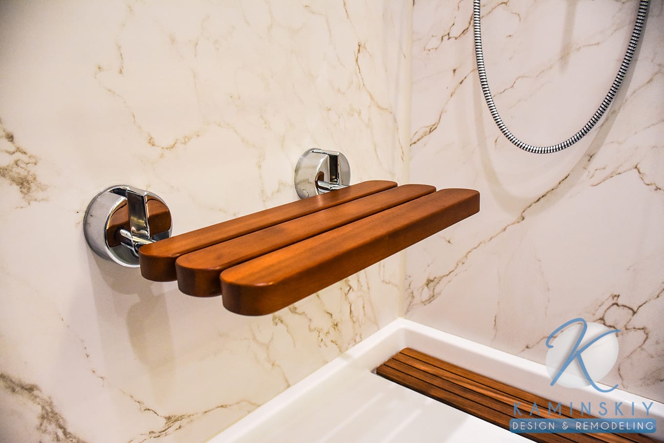 The shower features a built-in seat for maximum comfort and a unique draining system using wooden slats to cover the actual plumbing, so everything looks more natural than industrial in the main apartment.