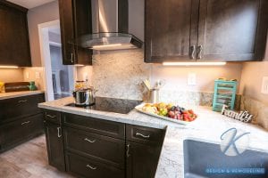 For the handles, the homeowners opted for a curved design that provides a balance against the sharp angles and lines of the cabinets and countertops.