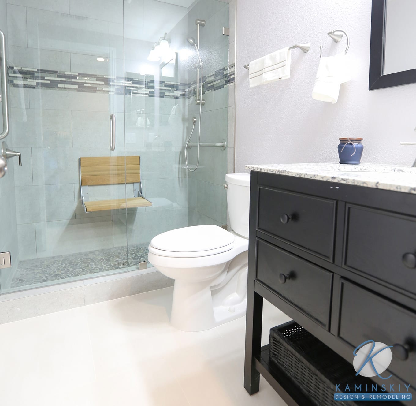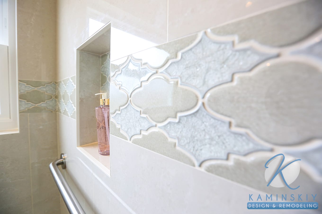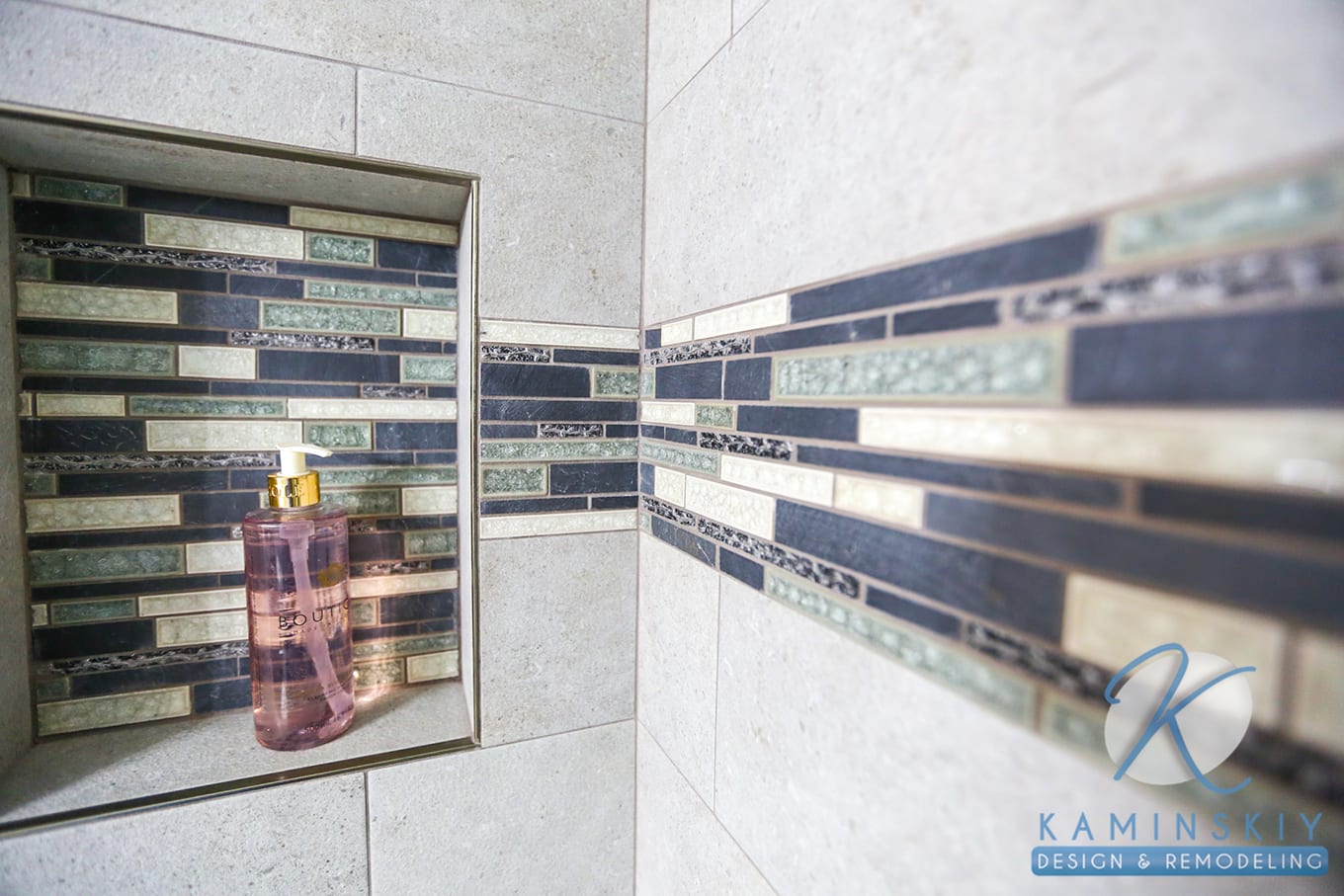 For the niche and decorative border, the owners chose a mixed glass and stone tile in shades of blue and seafoam green, with cream as a neutral third color. The bathroom itself has a freestanding vanity in dark brown-black tones with a marble countertop.