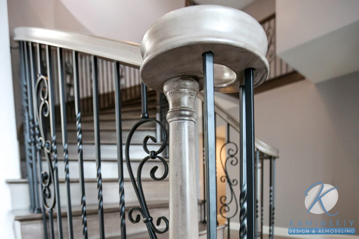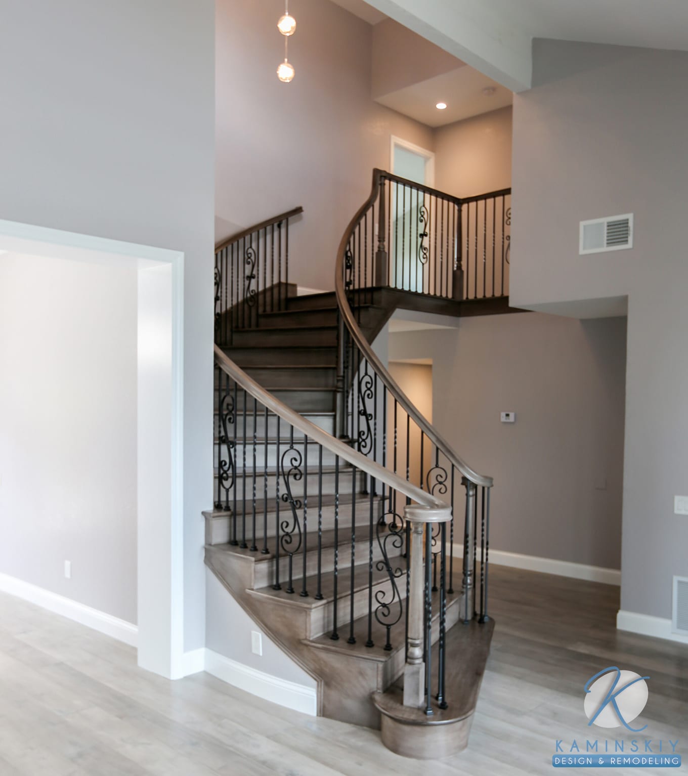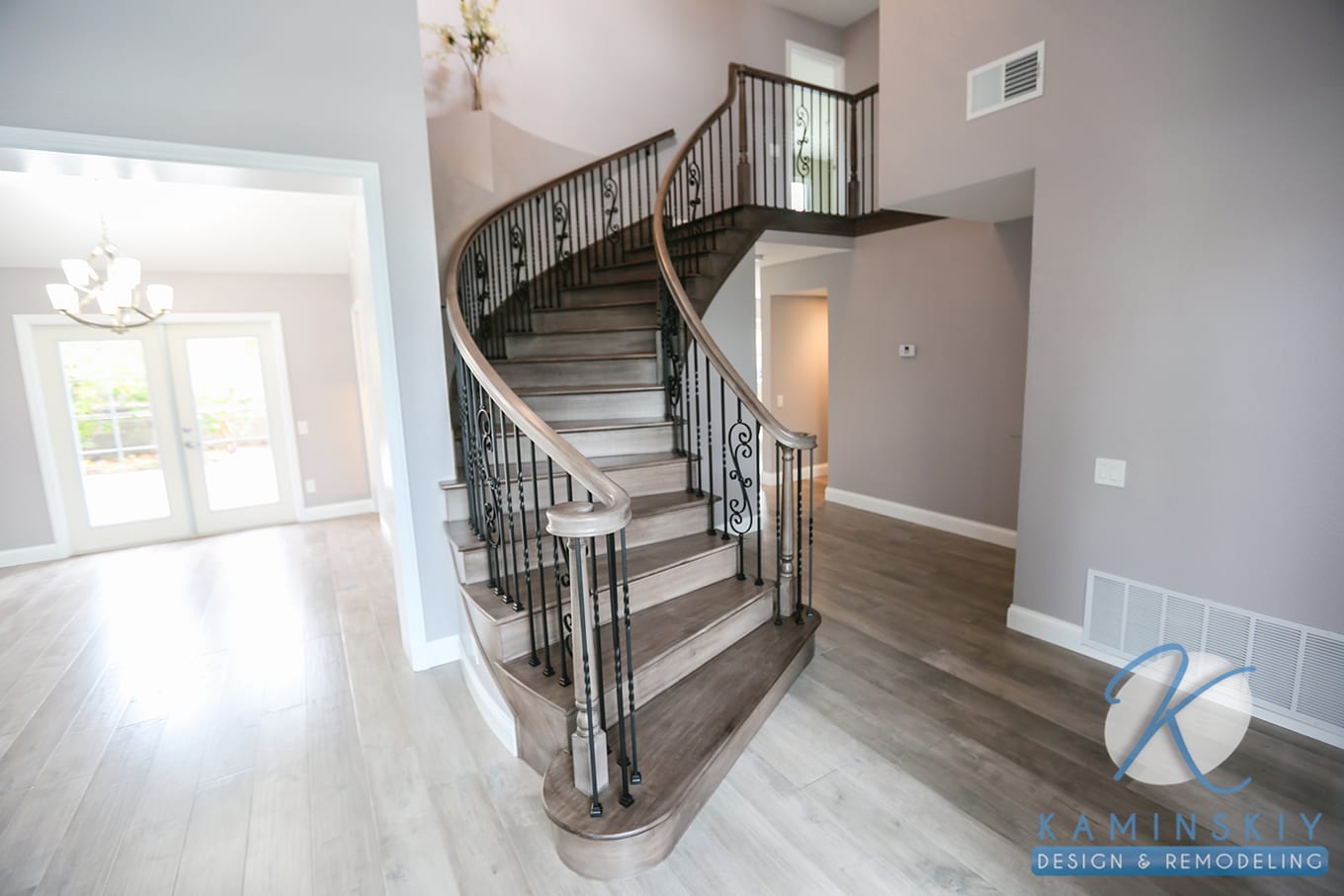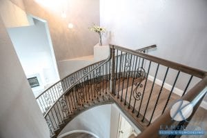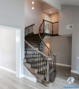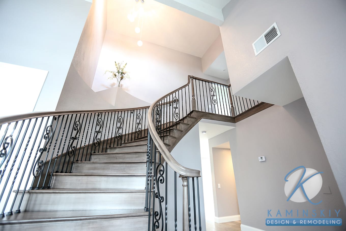 Part of this whole home remodel included creating an elegant, curved staircase with the same wood flooring used throughout the rest of the house. It leads up to completely remodeled bedrooms and bathrooms. One bedroom makes good use of a slanted ceiling, using the window and light tones to make it feel wider and longer than the room is.