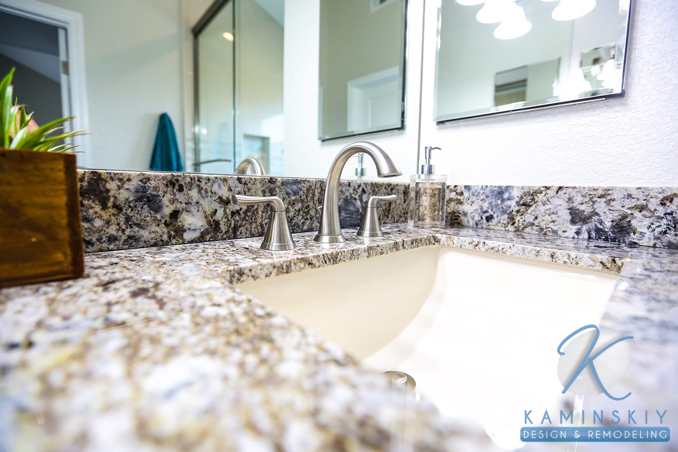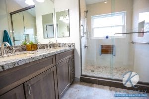 This space seeks to be slightly more refined than the other, with smoother textures and cleaner lines. The shower walls are tiled with an off-white variety and feature a horizontal border of curved, soft gray tiles. For the vanity, the owners chose a mixed granite countertop in grays and browns and used similar colors for the stain of the cabinets.