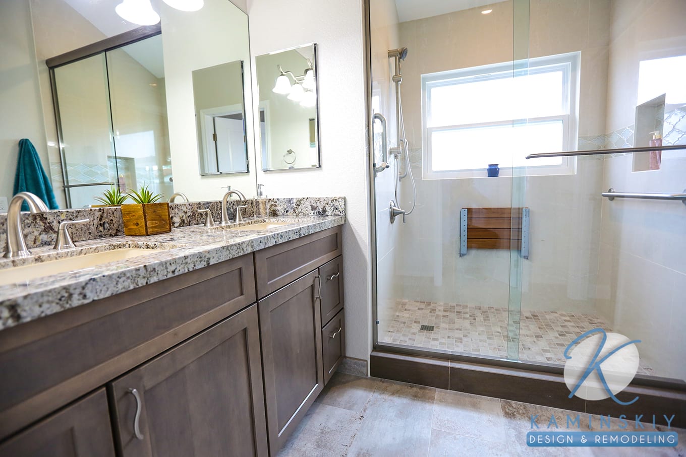 The larger bathroom in the home has a walk-in shower and, like the other one, also features a removable showerhead and seat. Square stone tiles make up the floor, as opposed to the natural stone tiles in the other bathroom.