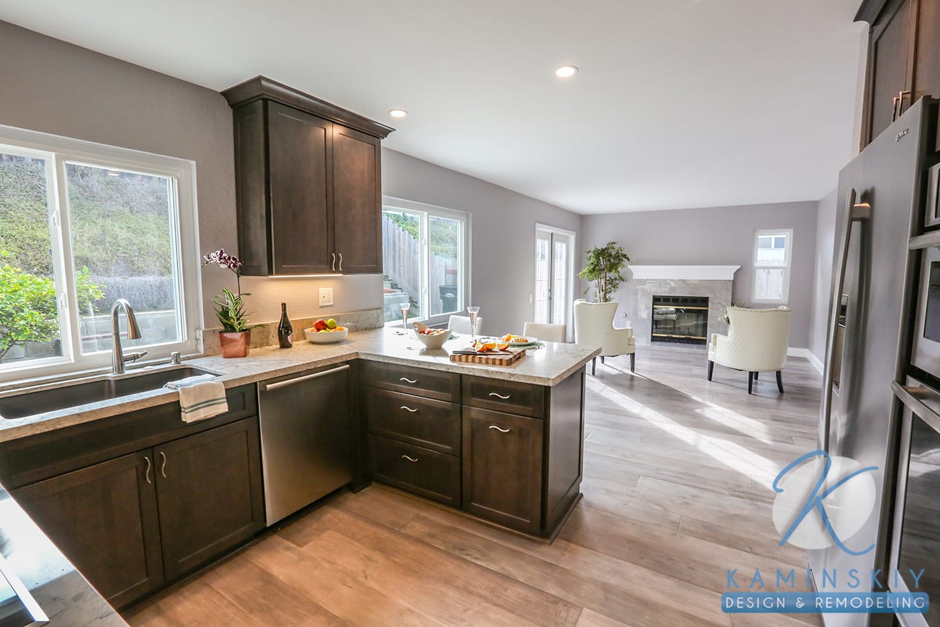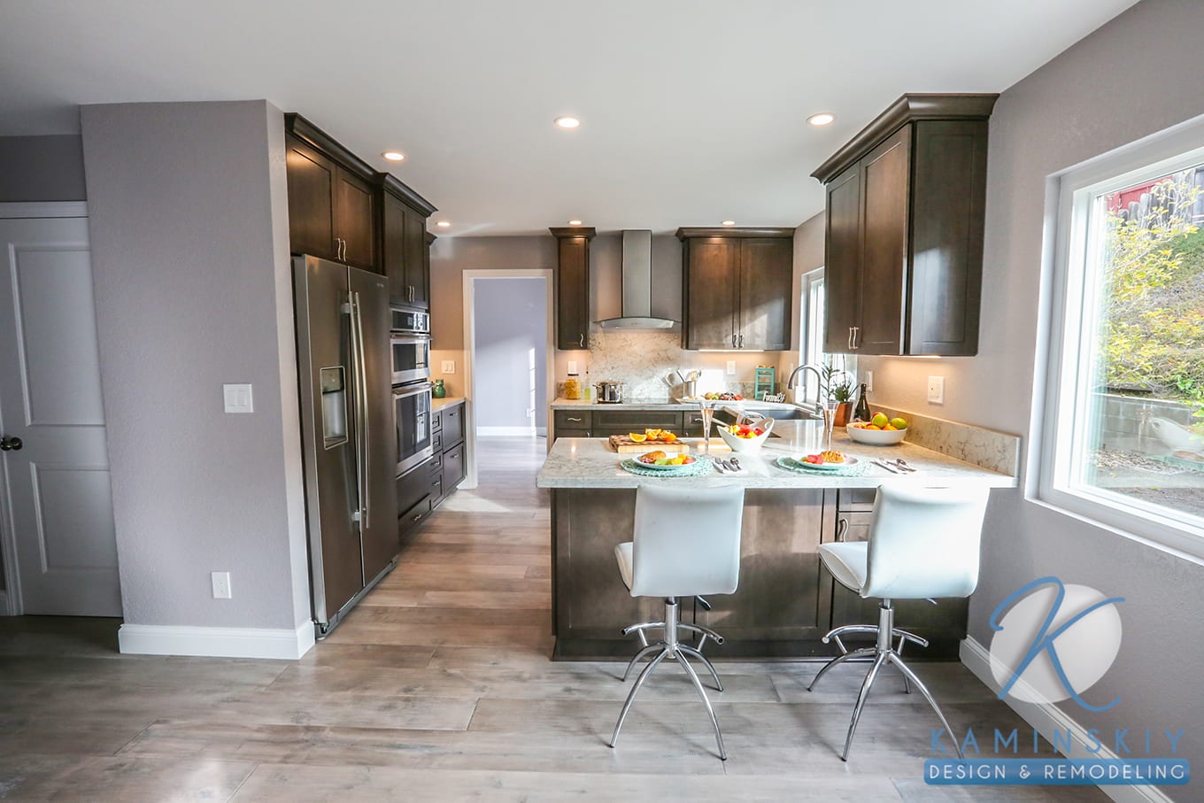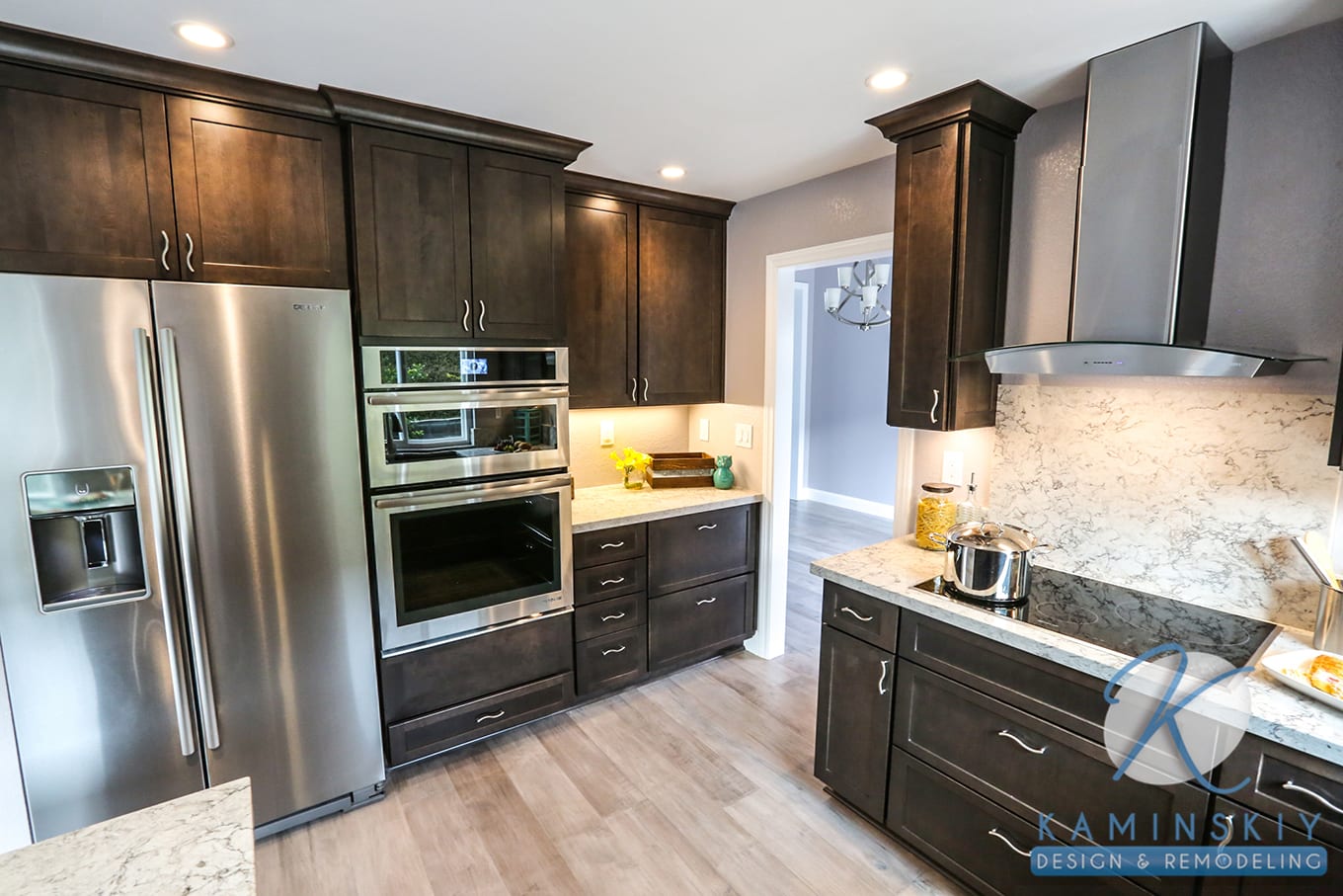 The entire home features light wood flooring that helps balance the light and dark elements of the design in each room. In the kitchen, it helps the dark brown cabinets stand out against the cool walls and other light features. A granite countertop doubles as a backsplash behind the stove, featuring gray streaks to tie into the cabinets, flooring, and silver fixtures.