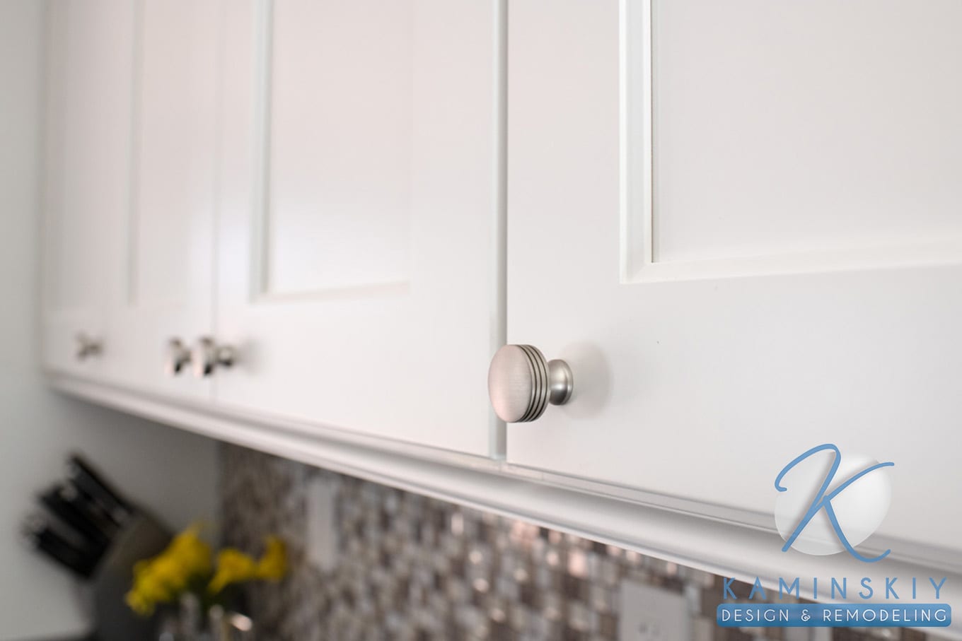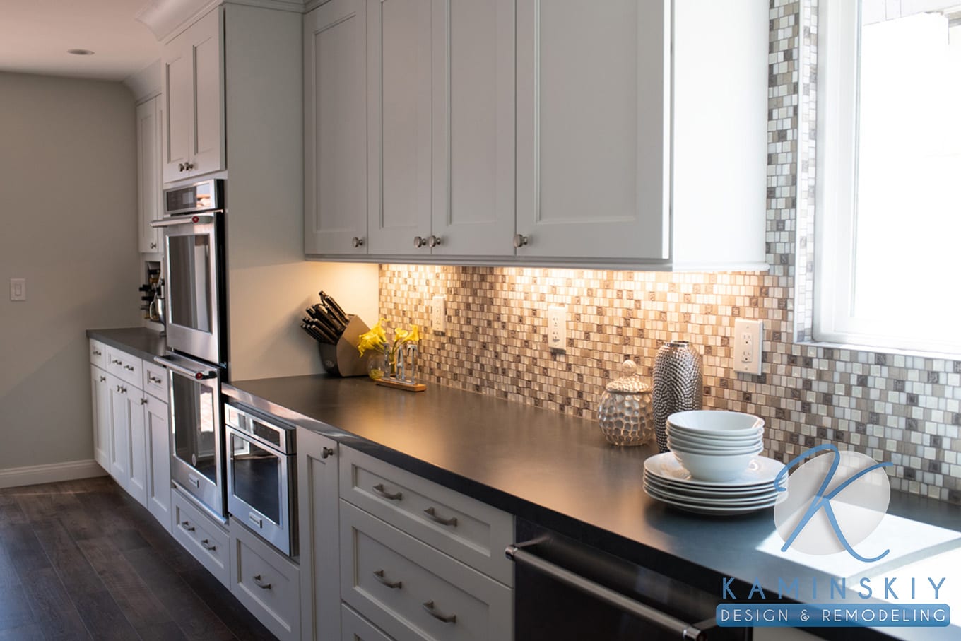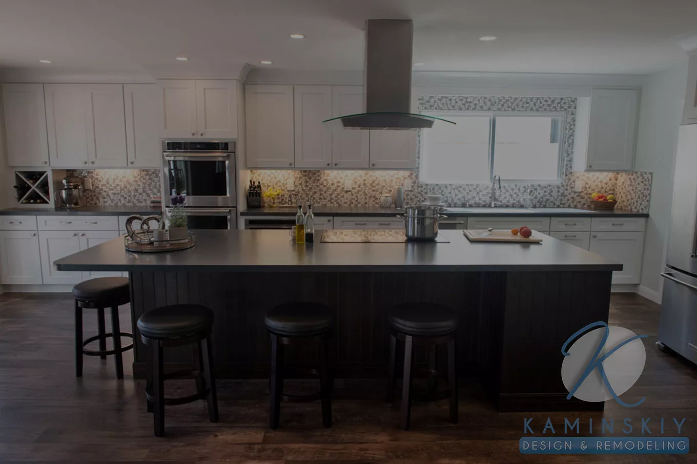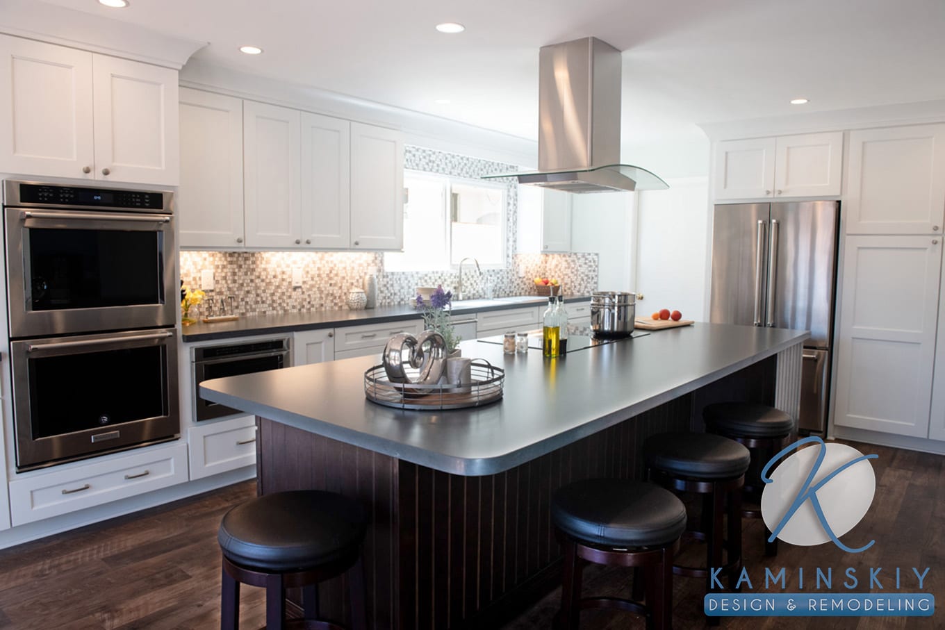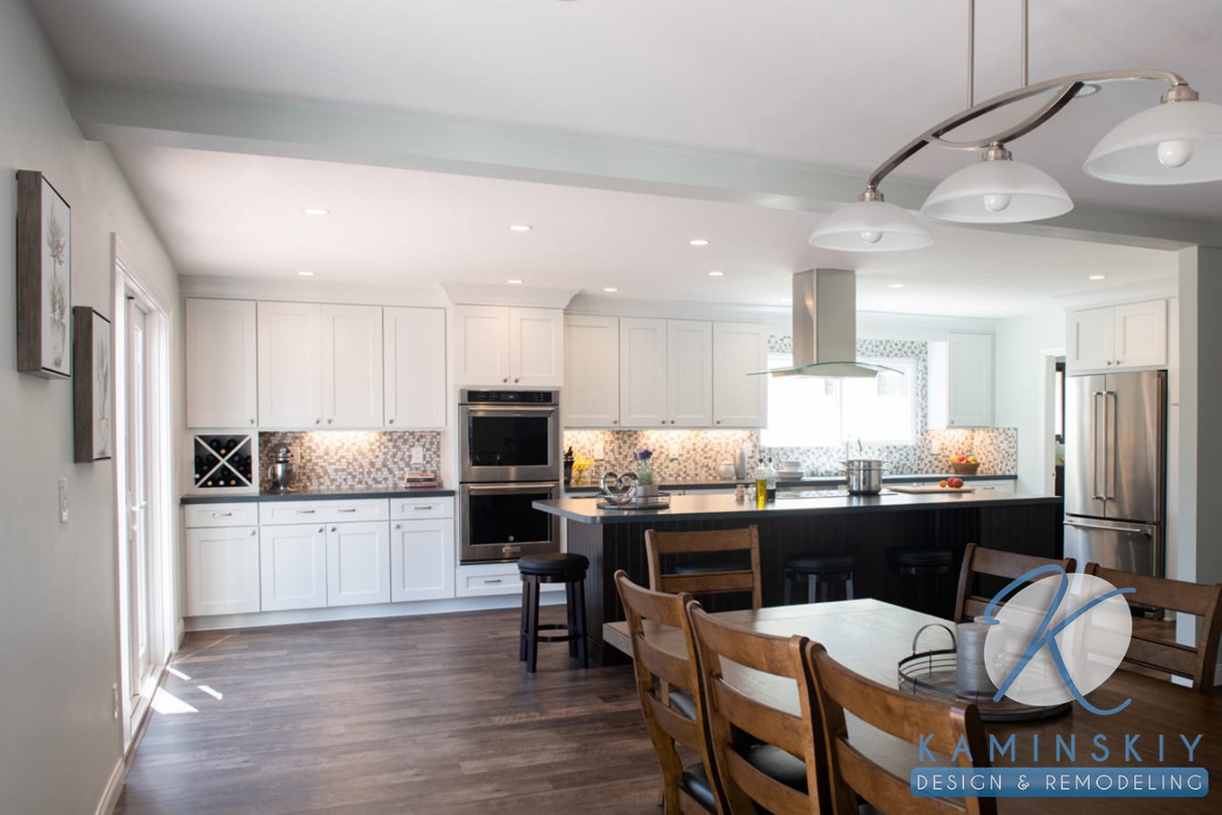 The dark wood tones found on the floor and island contrast the bright white cabinets and gray and white backsplash on the kitchen’s far wall. Silver appliances, including the hood and a dark gray, polished countertop, help bridge the gap between these opposing tones. The overall effect diffuses the light, so the lighting in the kitchen remains soft and works as the perfect place for entertaining guests.