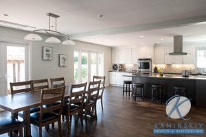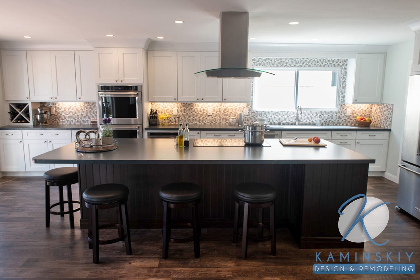 The homeowners of this Point Loma home desired an open-concept kitchen. Dark wood floors and a hood installed into the ceiling help keep the design open so the kitchen seamlessly flows into the dining room and beyond.