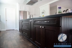 A simple, shaker-style cabinet keeps the focus on the darker island with its rich, deep brown color. This design also focuses on the backsplash rather than the cabinets themselves.