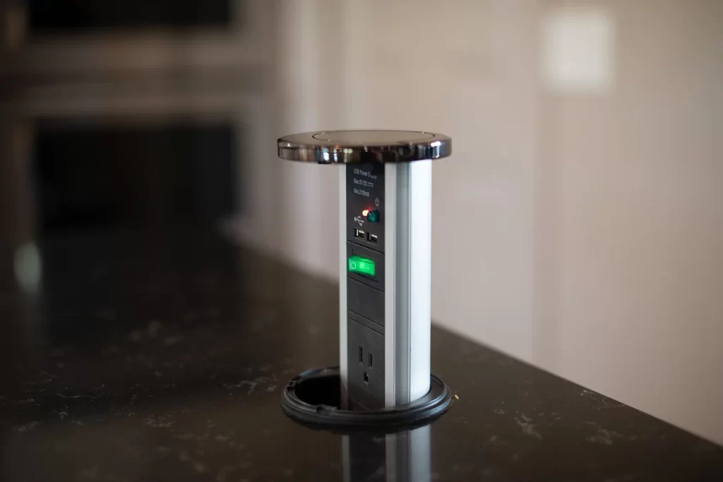 With limited space, the design had to carefully make use of the available square feet. It accomplishes this through clever storage solutions, including plenty of kitchen cabinets and breakfast nook benches that open to store anything from blankets to spare pillows. Another clever feature is the hidden charging port. It can be hidden away for added space when not in use and easily pulled up when needed.