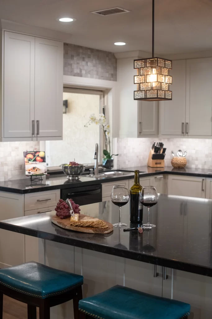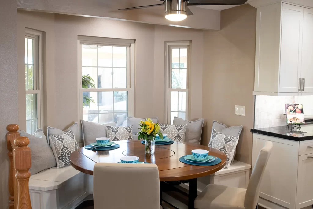There is plenty of seating in the breakfast nook area, with the benches providing seating against the wall and two chairs for extra seating around a small round table. A silver fan adds some metallic elements and provides lighting to supplement the sunlight coming through the windows. Silver is continued as a metallic element in the pendant lighting. It is geometric with interlacing features that protect the bulb. Glass helps refract the light to increase the luminance.