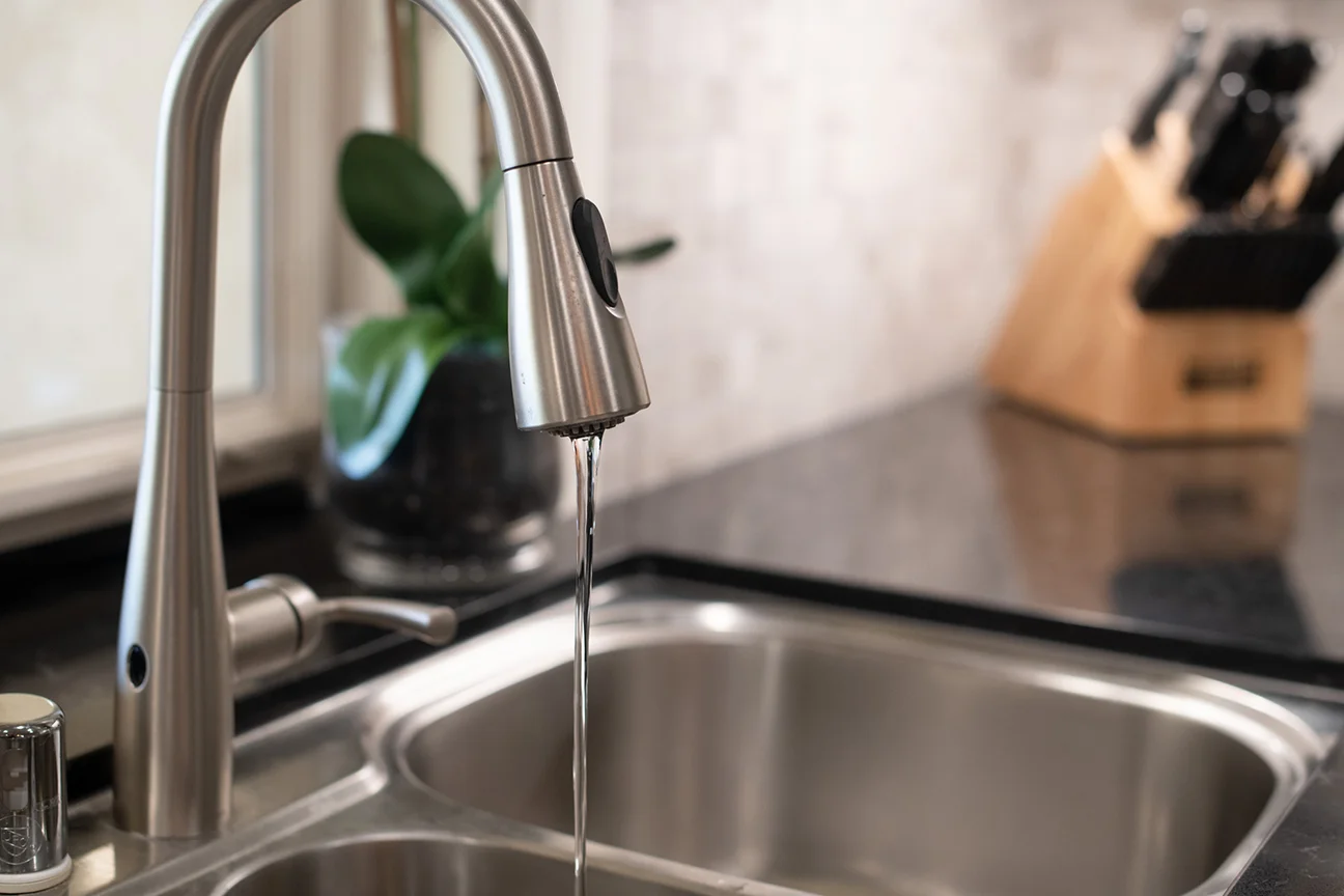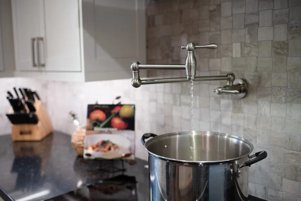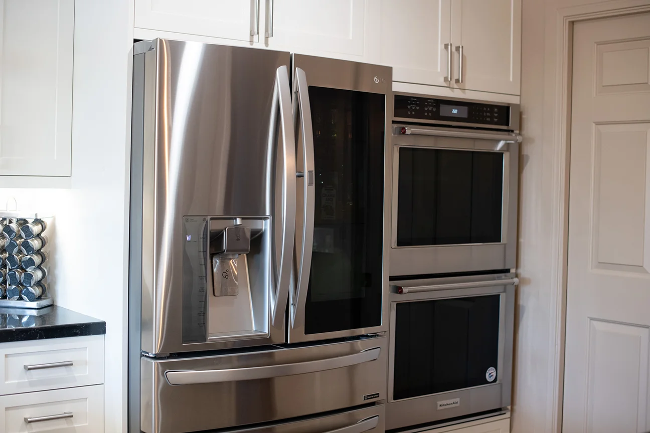 Gray tiles line the back walls of the kitchen as a backsplash, in variegated gray tiles that offer visual interest and a practical solution to splatters and other kitchen messes. It also helps soften the harsher stainless-steel appliances, so they are not so glaring.