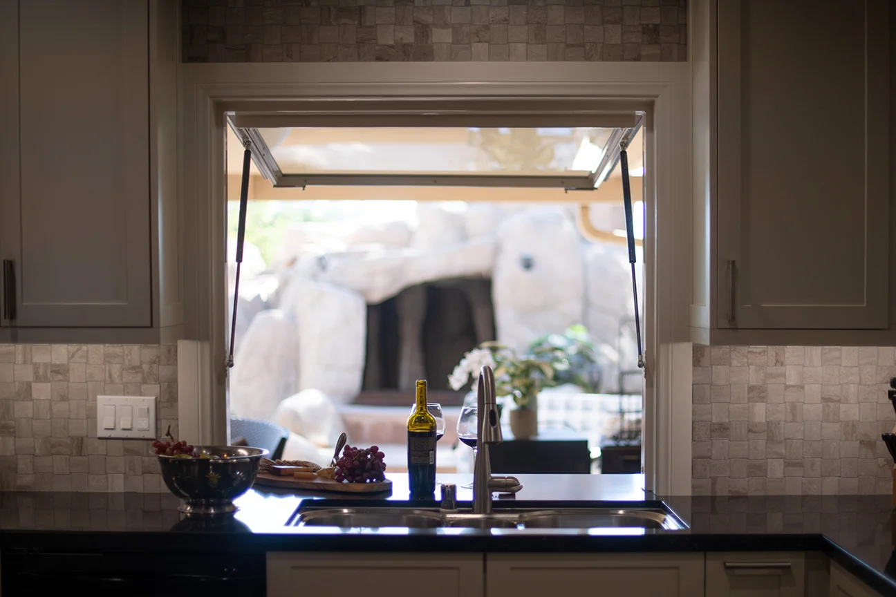 A mid-tone brown finish is used on the flooring to act as a neutral backdrop to the rest of the kitchen’s design. It allows the white cabinetry to pop against the gray tiled walls and soft natural lighting. The countertops are dark brown, almost black, with a beautiful shine reflecting the sunshine from the windows. One window above the sink opens to create a makeshift bar and another set of windows in the breakfast nook area.