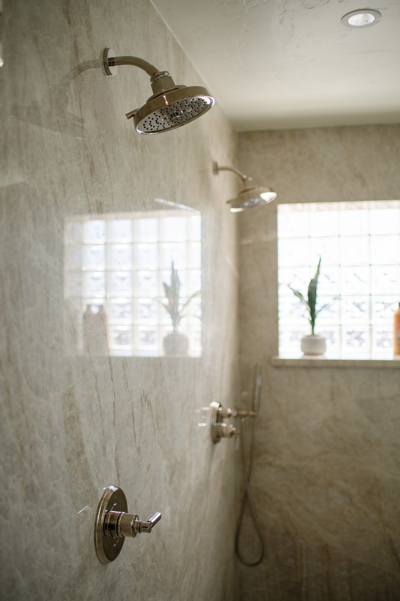 The clients’ initial concept included a four-wall, fully tiled shower that exceeded budget and would have blocked natural light.