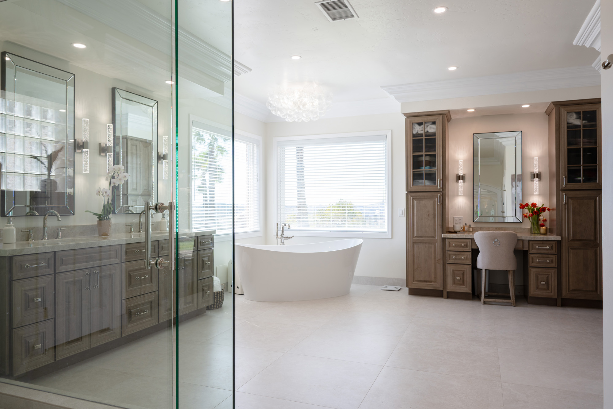 After: Removing walls and switching to frameless glass opened sight lines throughout. Perla Venata quartzite slabs create a seamless, low-maintenance shower surround, while the heated freestanding tub anchors a relaxing corner with panoramic views. A new makeup vanity completes the spa experience.