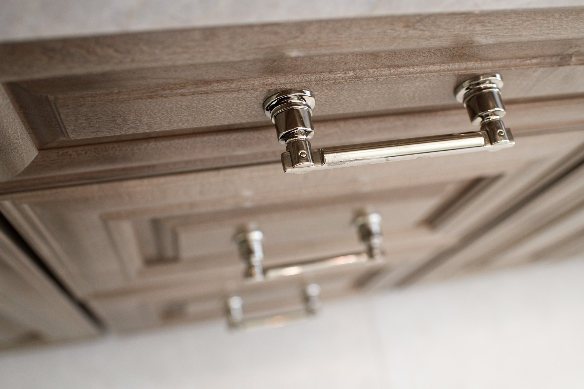 Hardware: Polished-nickel pulls and knobs—refined details that echo the fixtures and elevate every cabinet touchpoint.
