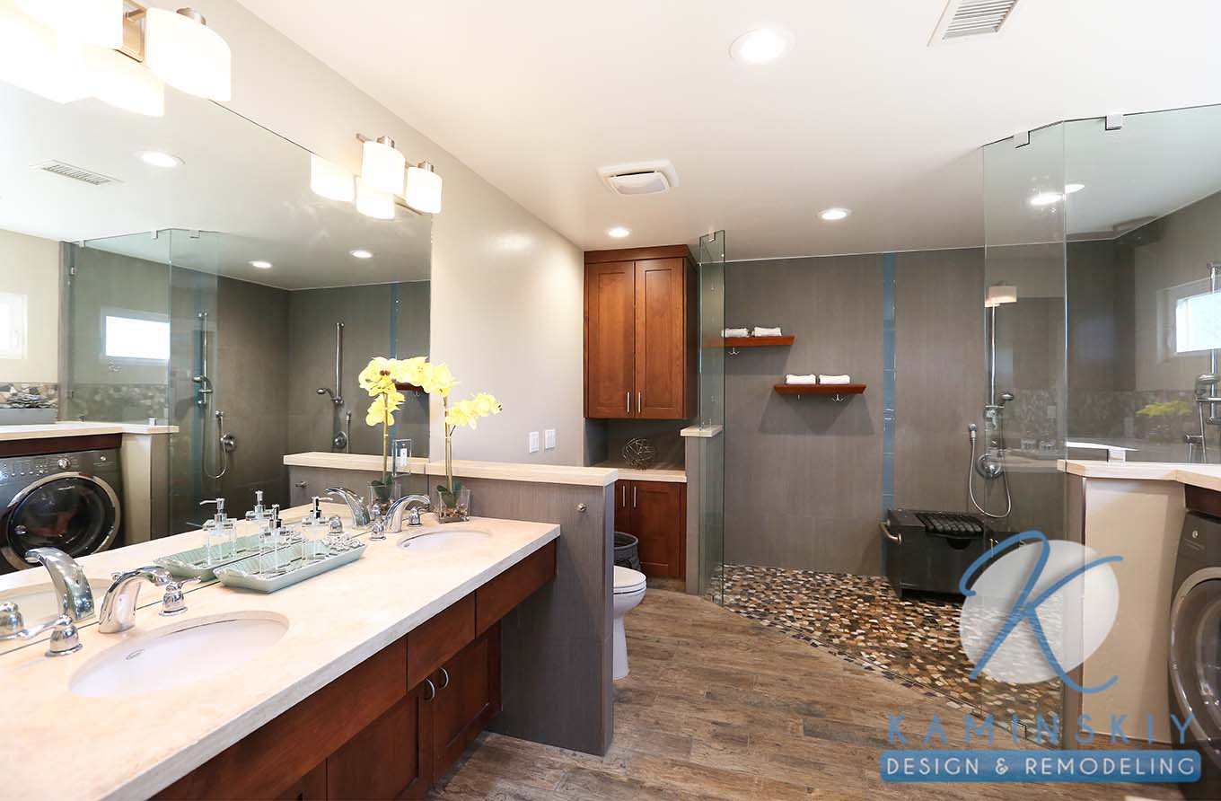 The owners of this Rancho Bernardo home needed a roomy, accessible master bath with built-in laundry units. This resulted in a space that embodies both elegance and universal design principles.