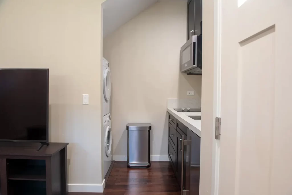 The use of modern design elements, combined with functional furnishings, makes it a highlight of the ADU conversion. The laundry room in the ADU conversion is a blend of functionality and style. The use of modern appliances, combined with ample storage space, makes it a practical space.