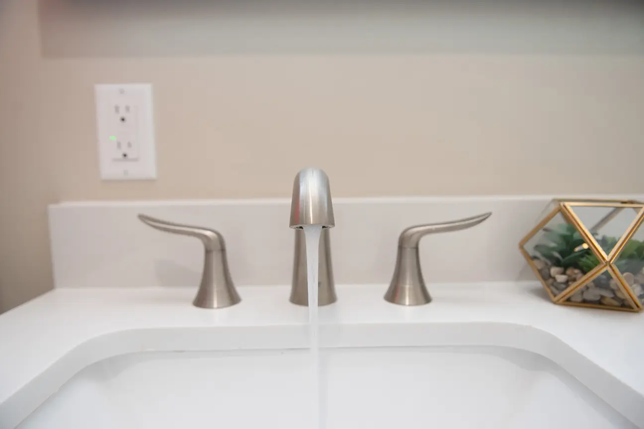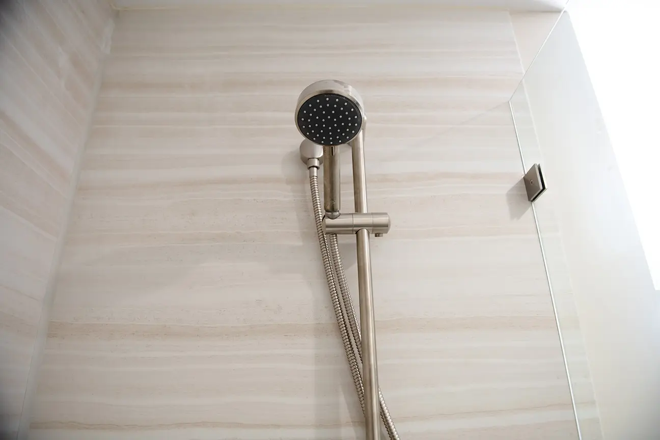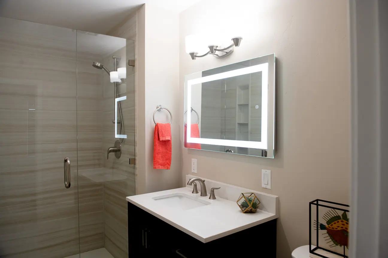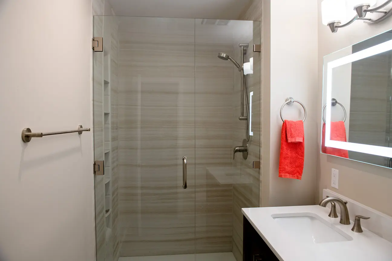 The sink area is a blend of functionality and style. With modern fixtures and a minimalist design, it complements the overall theme of the ADU. The shower area is a testament to luxury. The modern showerhead, combined with the sleek design of the tiles, offers a spa-like experience.