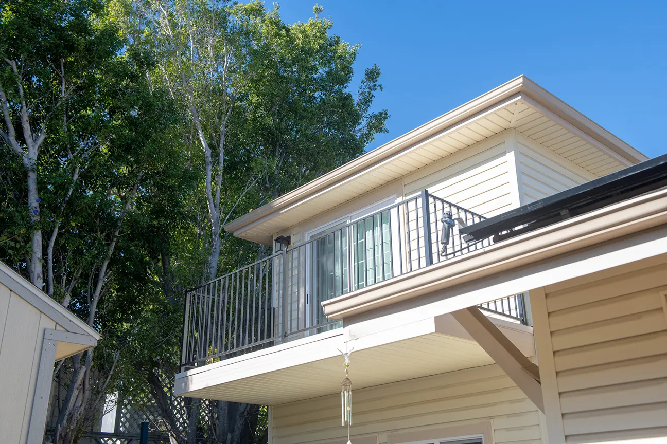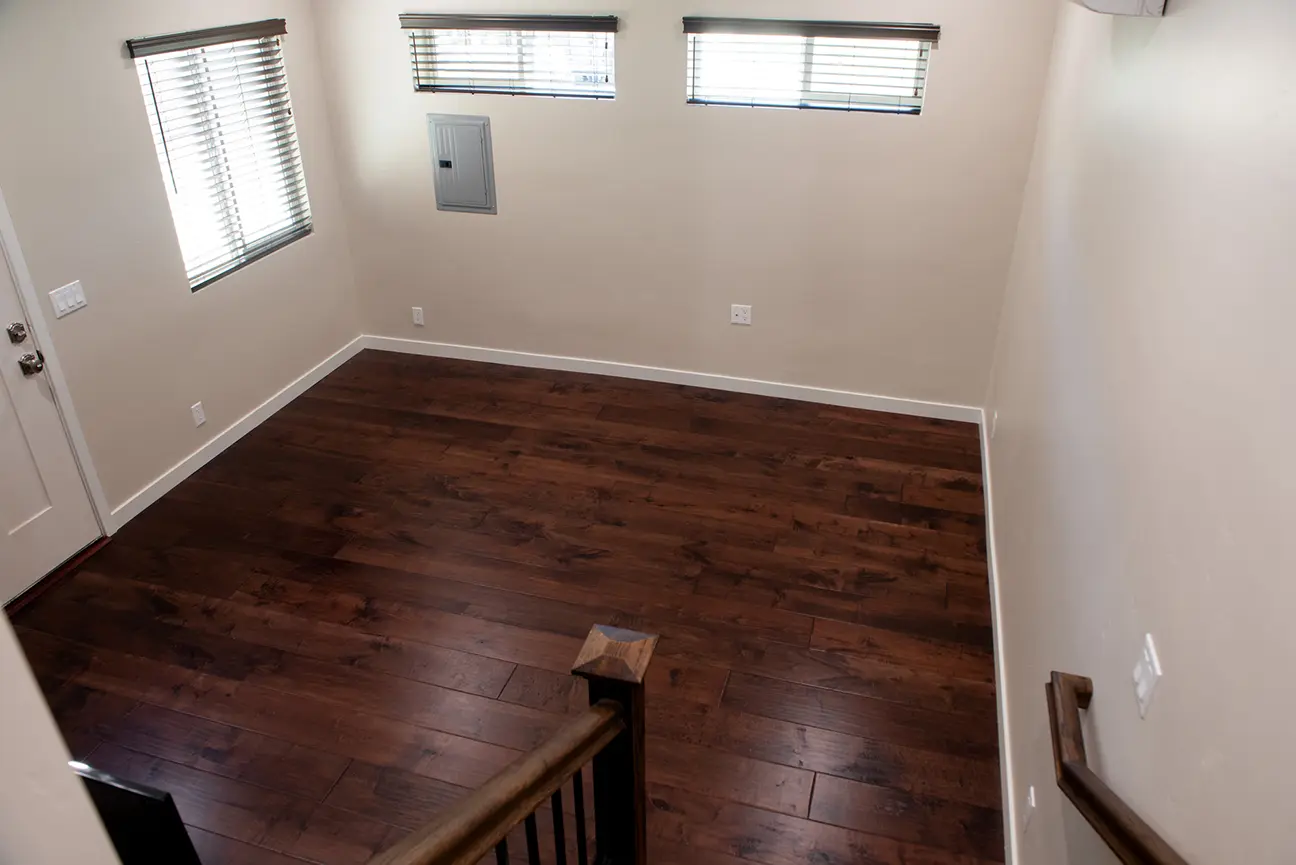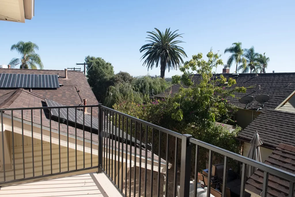 The balcony area of the ADU conversion is a perfect space to relax and enjoy the views. The use of wooden flooring and modern railings adds to its charm. The second story of the ADU offers spacious interiors with a blend of modern design elements. The use of large windows ensures ample natural light, making the space feel open and airy.