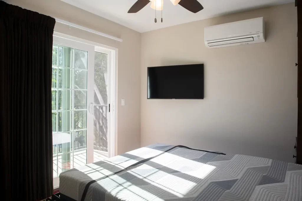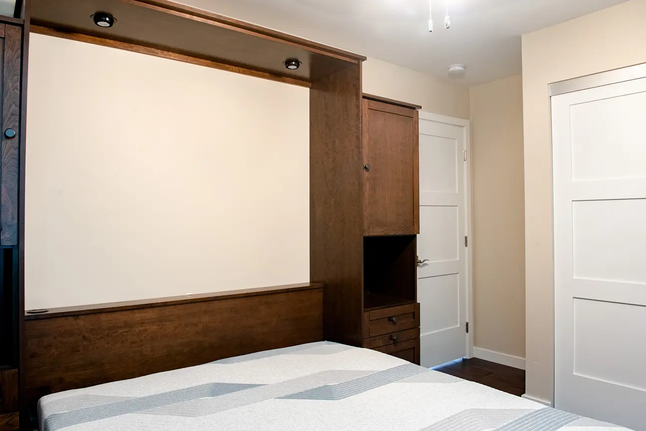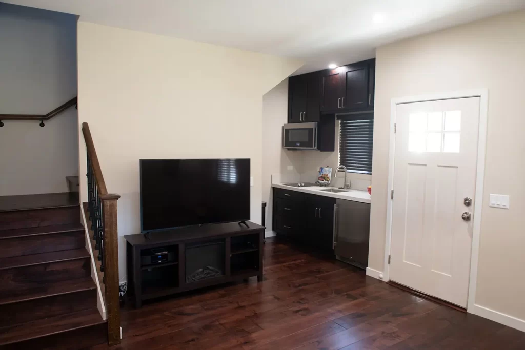 The bedroom in the ADU conversion is a blend of comfort and style. The strategic use of lighting, combined with modern furnishings, makes it a perfect space for relaxation. This bedroom offers the best of both worlds – entertainment and views. The positioning of the TV, combined with the large windows, ensures you can enjoy your favorite shows while soaking in the views.
