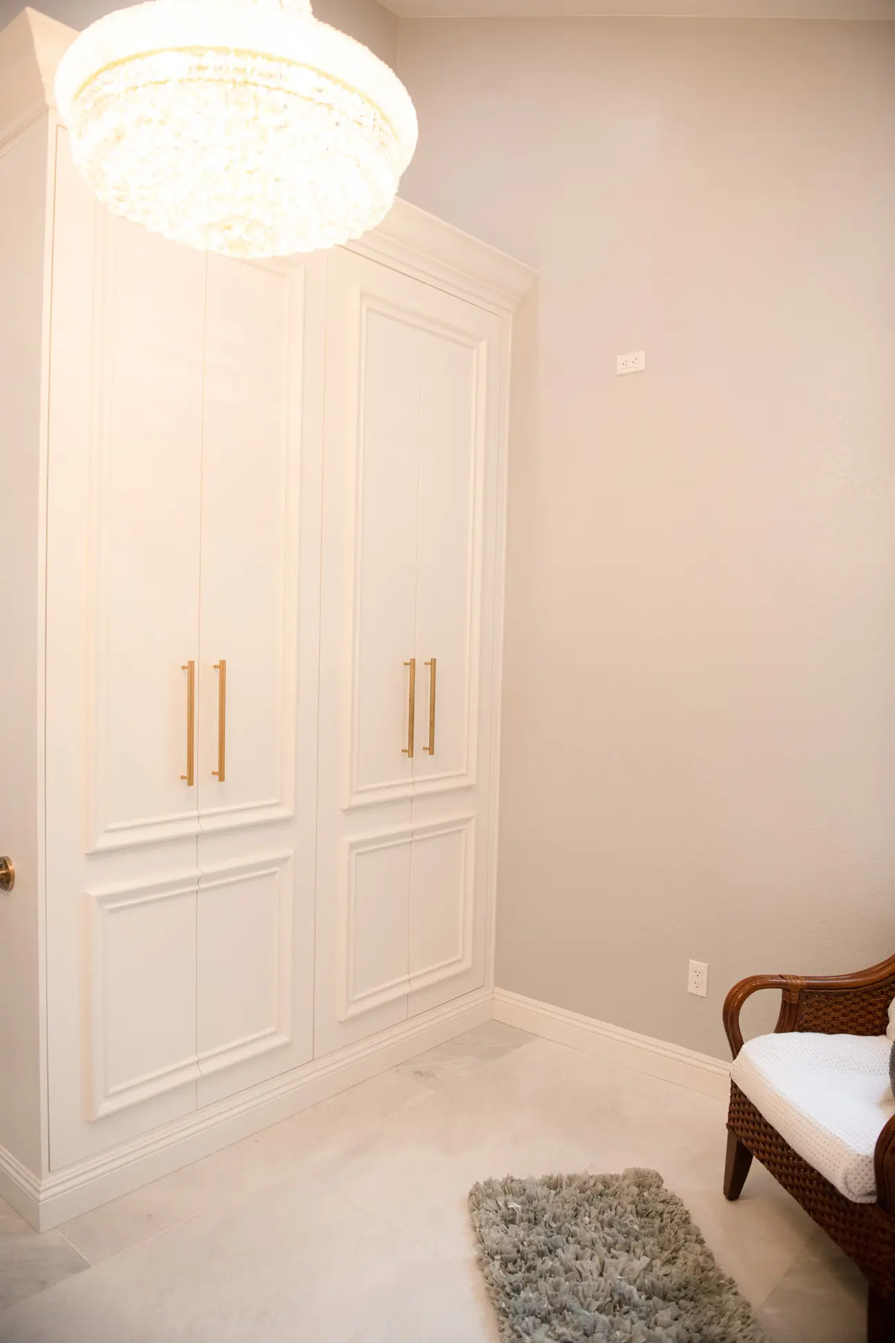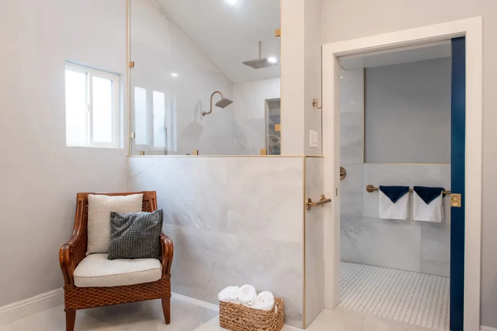 For an added touch of class, a chandelier hangs over a seating area tucked across from the shower. Its glass beads are also reflected in the lighting above each mirror behind the sinks. Two chairs with luxurious pillows offer the owners a place to get ready for the day. Built-in cabinets also provide storage for linens or the owners’ next outfits. This makes the bathroom the perfect space for getting ready without making several trips between the bed and the bathrooms.