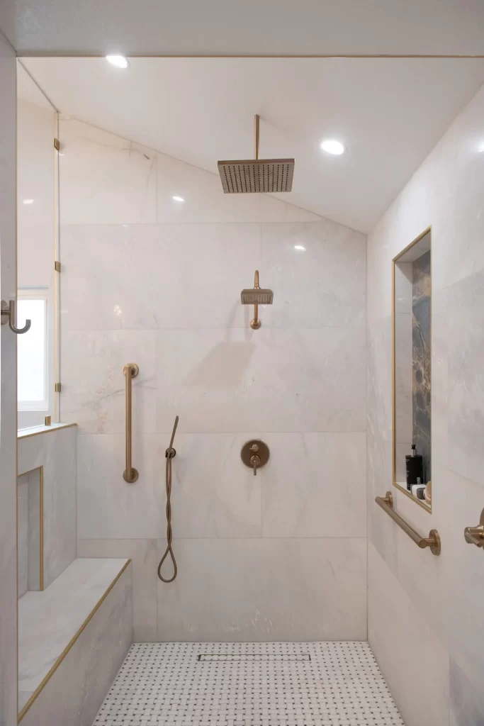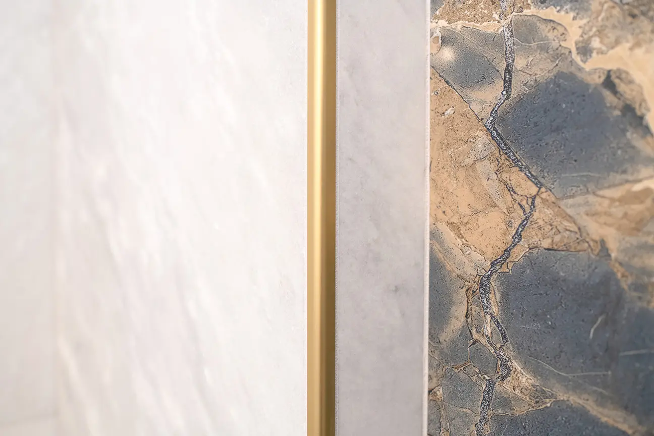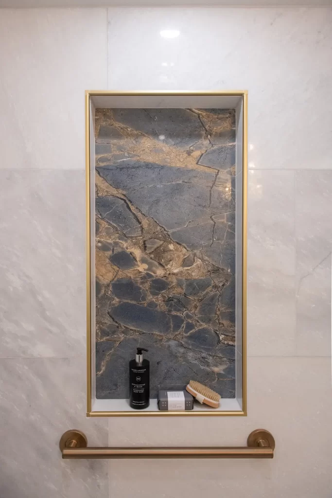 Some blue is found in the niche meant for shampoo and conditioner in the shower, but it is a blue-gray that looks classic in this marble-like material. A sandy brown mimics the glowing gold features, too, further tying this to classic luxury rather than anything related to sailing. More subtle blue flashes can be found in the tile flooring, but it is pearlescent here, meaning the contrast between the white is much more subtle.