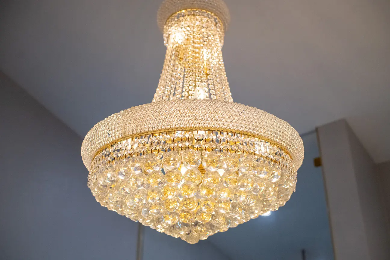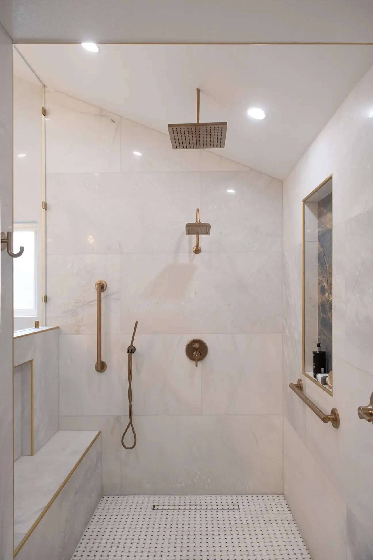 This bathroom, unfortunately, lacks larger windows which could provide it with natural lighting. To combat this and keep the space from feeling too dark, the chandelier and lights above the mirror are supported through recessed lighting that blends into the ceiling. In fact, it would be hard to tell this space is dark when these lights are on!
