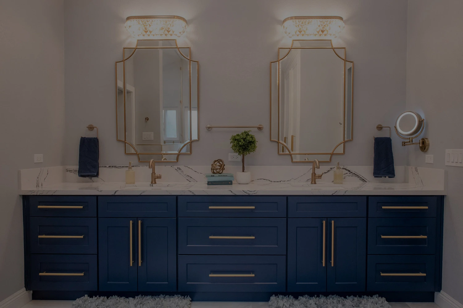 This space is meant to be shared by two people, with matching his and hers sinks. This, by no means, makes the area crowded, though. There is plenty of space between the two sinks so both people can get ready in the morning without encroaching on the other’s space. Matching gold framed mirrors, lights, and towel holders complete the symmetrical look.