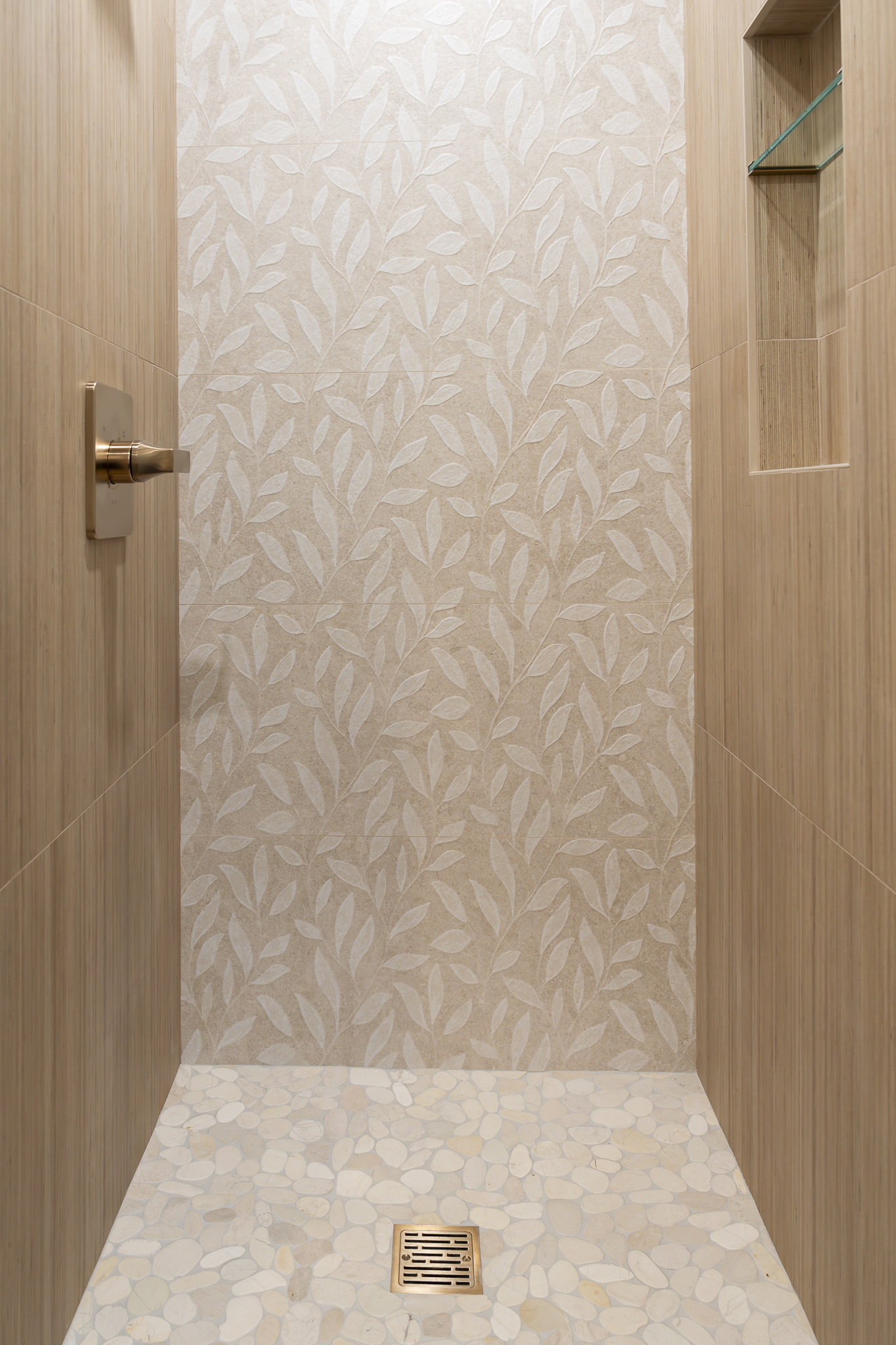 Swipe through for the highlights: Shibusa porcelain with a pebble-mosaic shower floor downstairs; upstairs, a patterned Ethnic porcelain floor, Kohler Archer tub with polished wall tile, and a blue Shaker vanity topped in Lumatáj quartz.