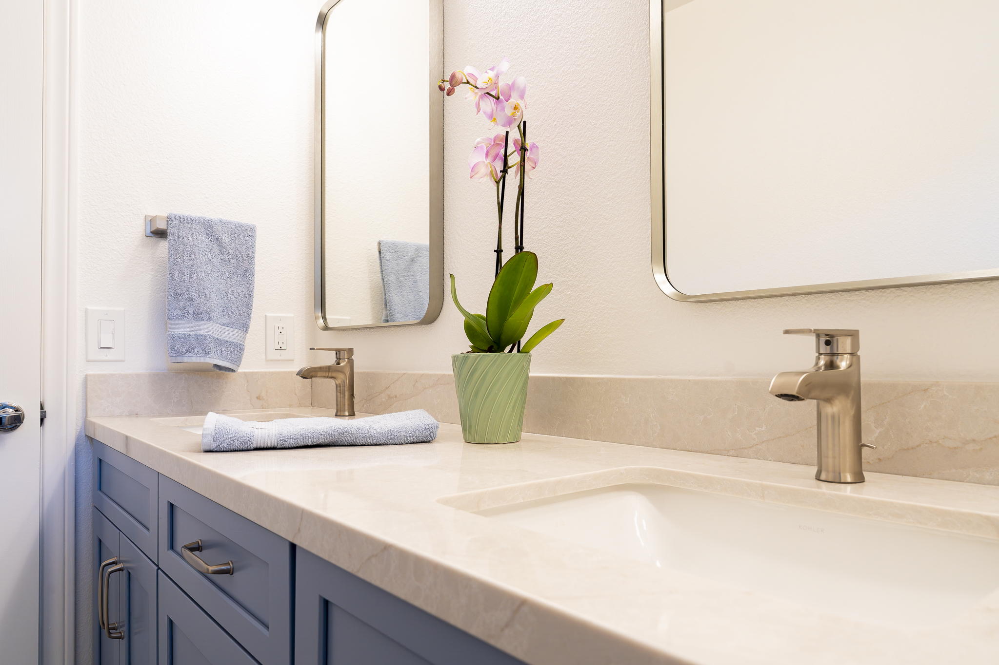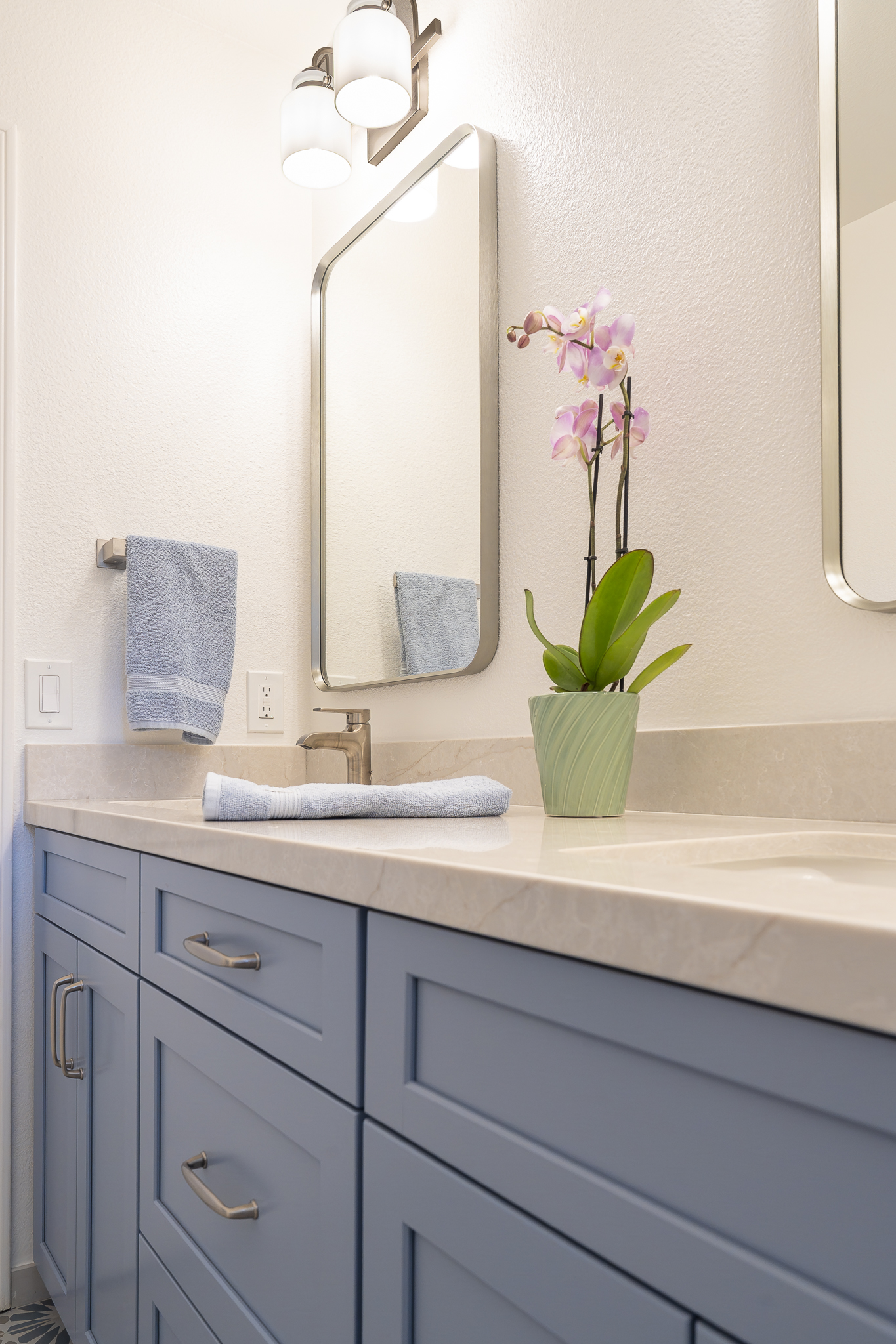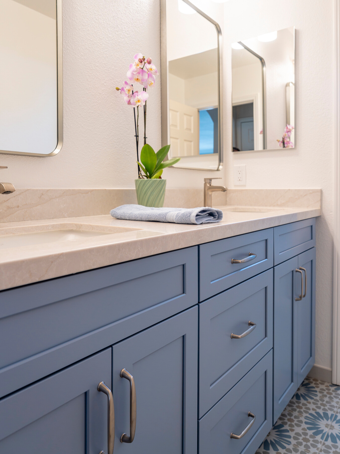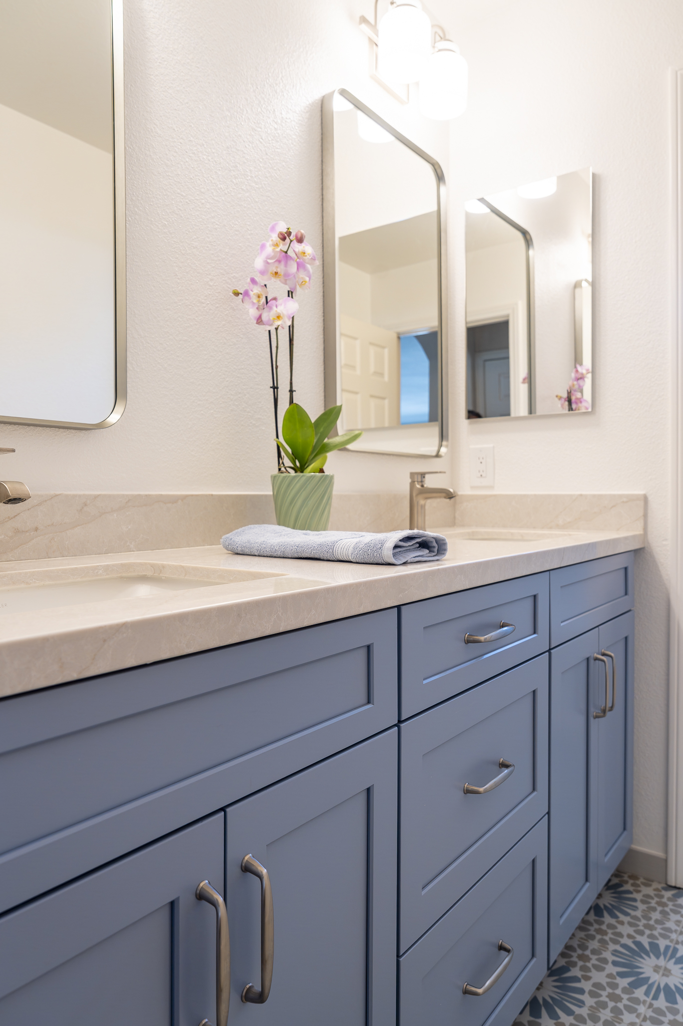 These two outdated bathrooms received a complete transformation with thoughtfully coordinated upgrades throughout. Our team installed custom cabinetry and premium quartz countertops, modernized the plumbing and lighting systems, and fully retiled all wet areas for a fresh, cohesive look. Working collaboratively with our design team, the homeowner curated a refined palette of calm neutrals and soft blues, selecting durable, low-maintenance surfaces that perfectly complement the home’s existing aesthetic while ensuring years of effortless upkeep.