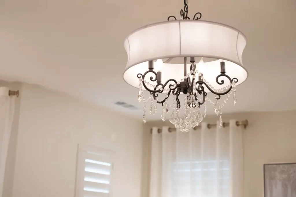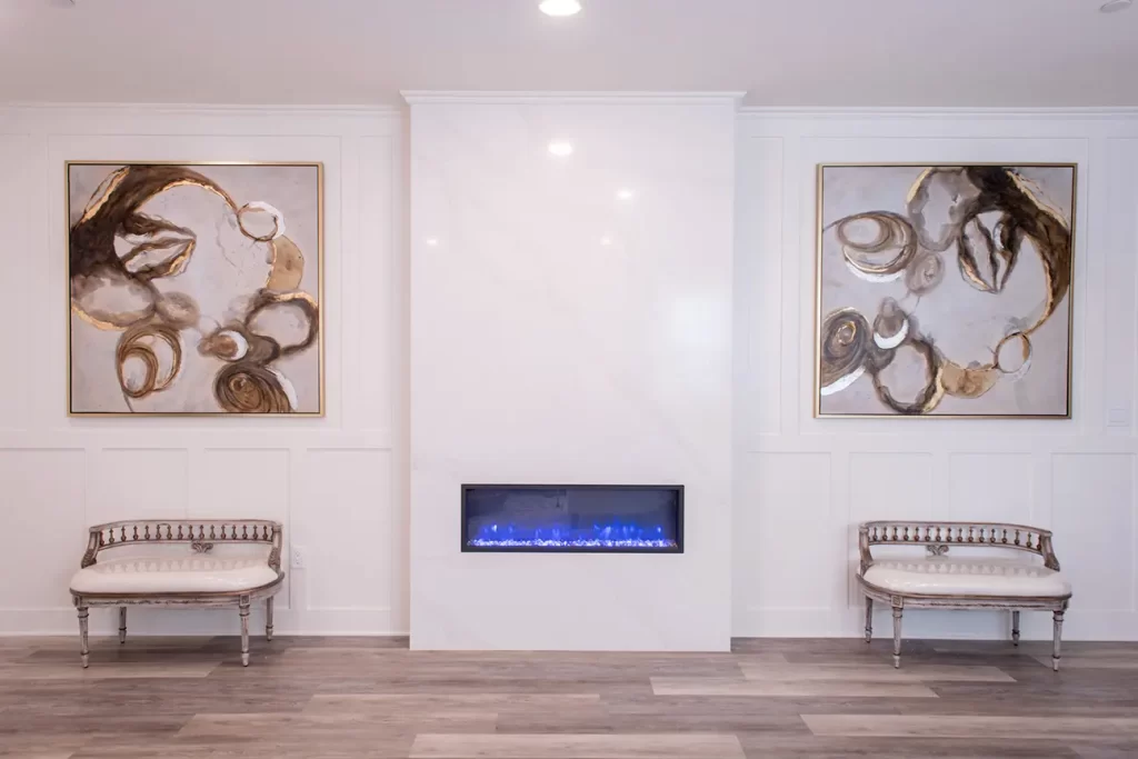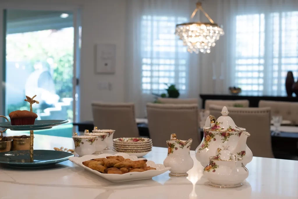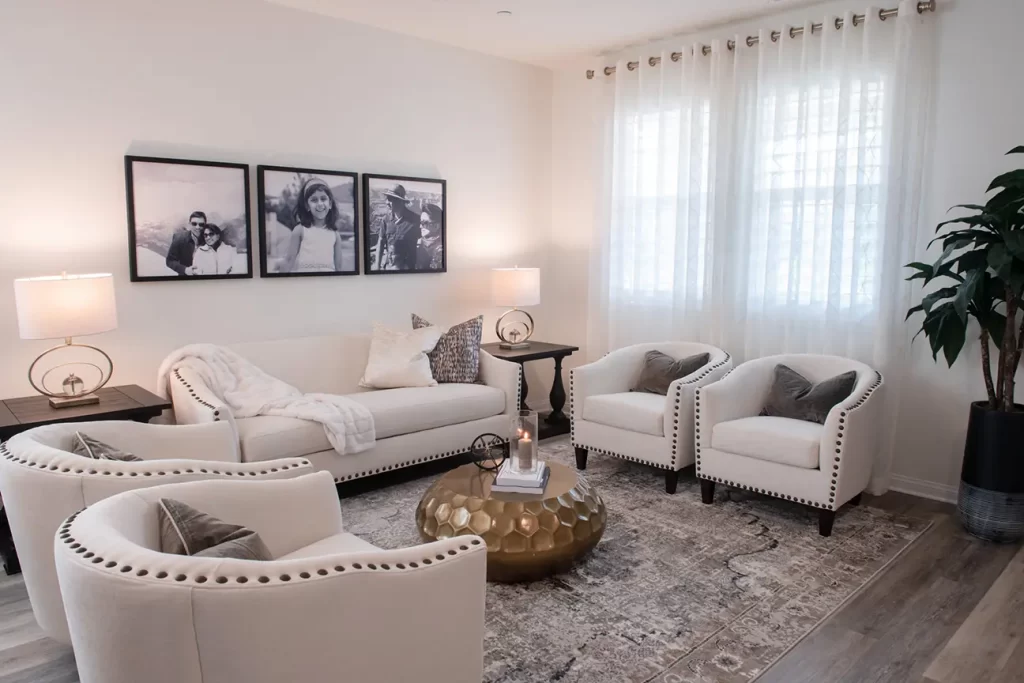 This San Diego home underwent an elegant makeover to reflect the homeowner’s lifestyle. Upon entering the home, visitors are greeted by a drawing room with ample seating for guests. To keep things neutral, the chairs are soft and off-white with pewter gray accent studs that pull from the various gray tones in the rug, wood flooring, and accent pillows. Pops of gold add an elegant flair to the entire design and can be found in the lighting and coffee table.