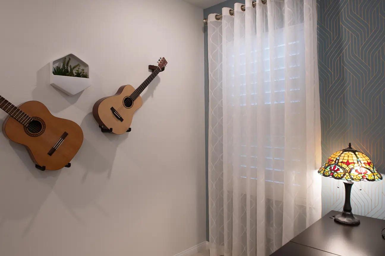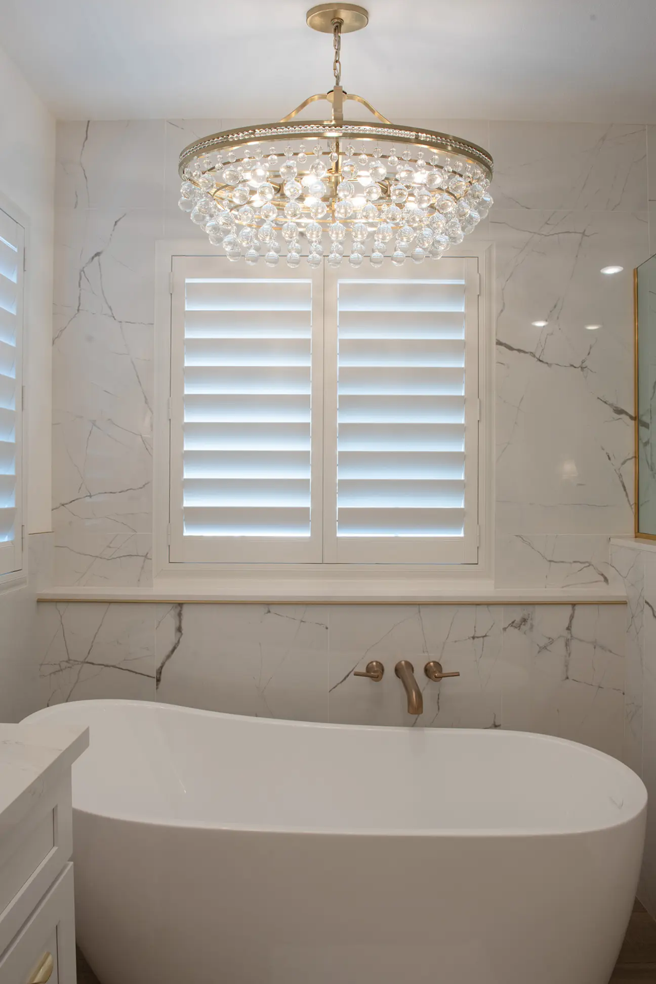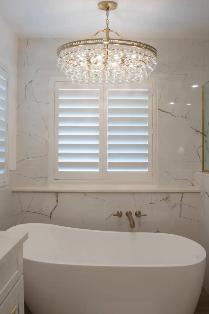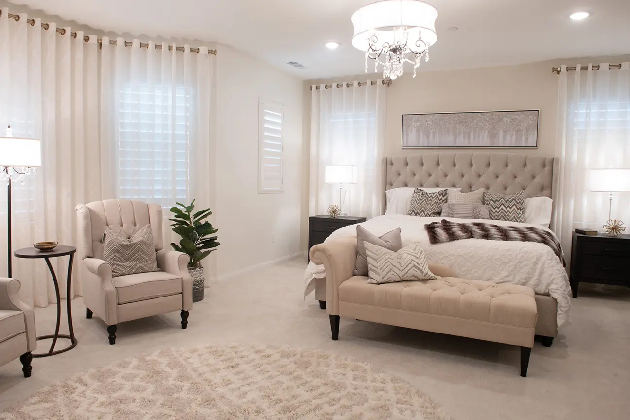 Similarly, the master bedroom and ensuite feature a bronze finish mixed in with the same creamy whites and neutral grays throughout. The spacious area reflects the rest of the open floor design in the house. With gold accents and marble finishes, the result was a luxurious space fit for an elevated lifestyle.