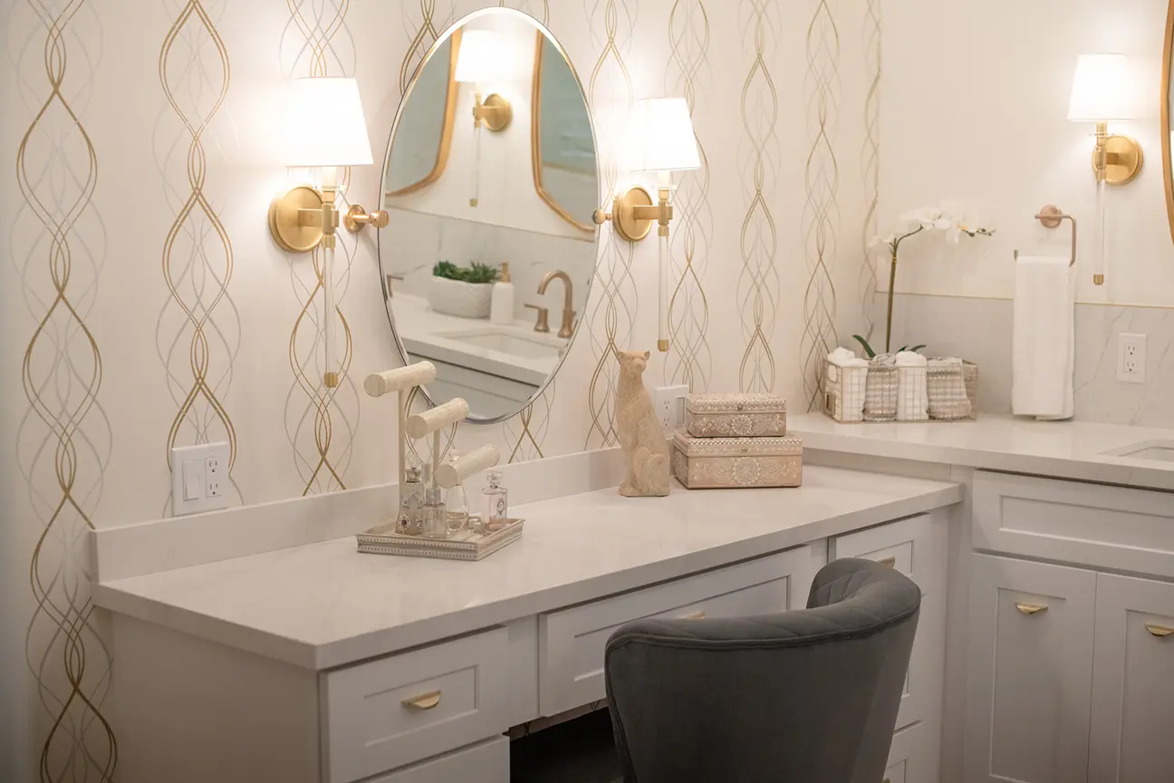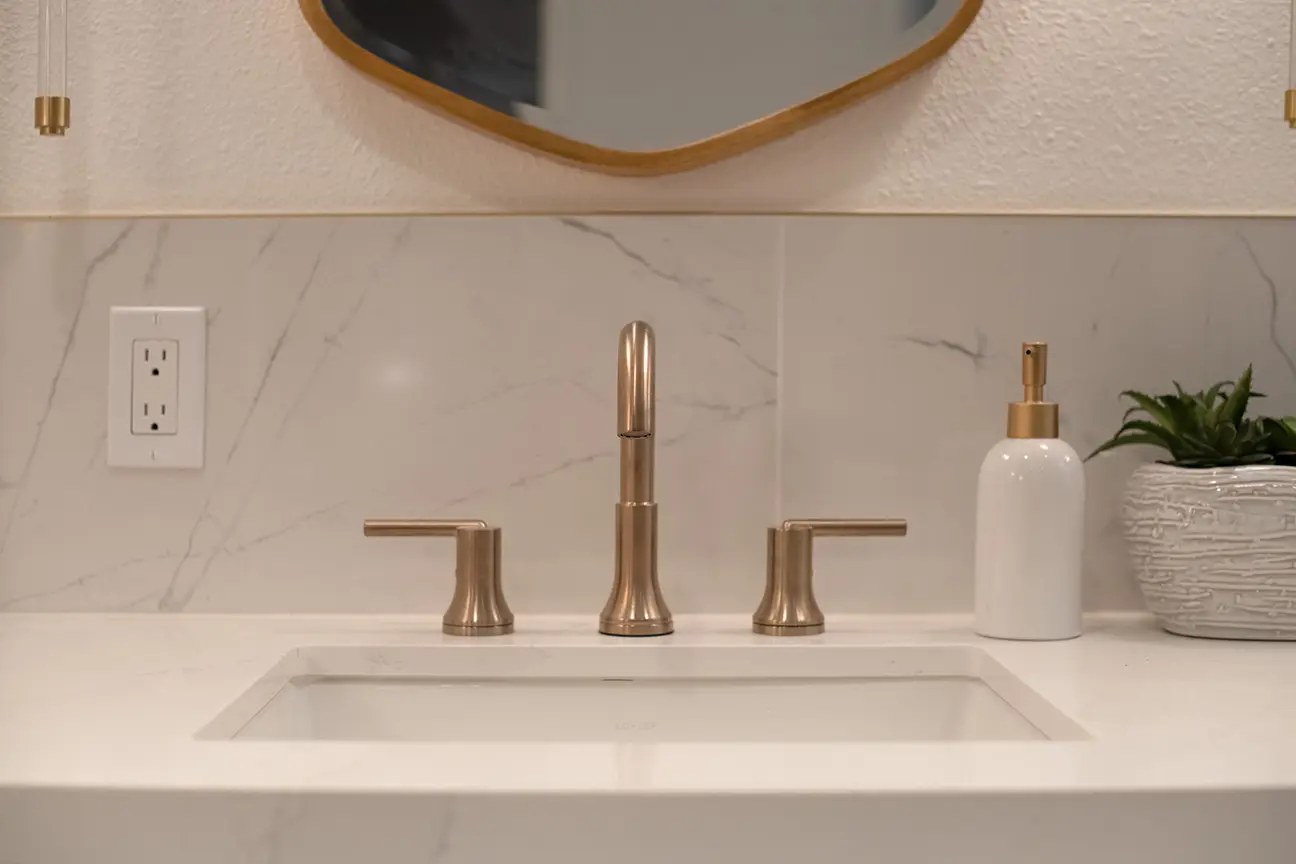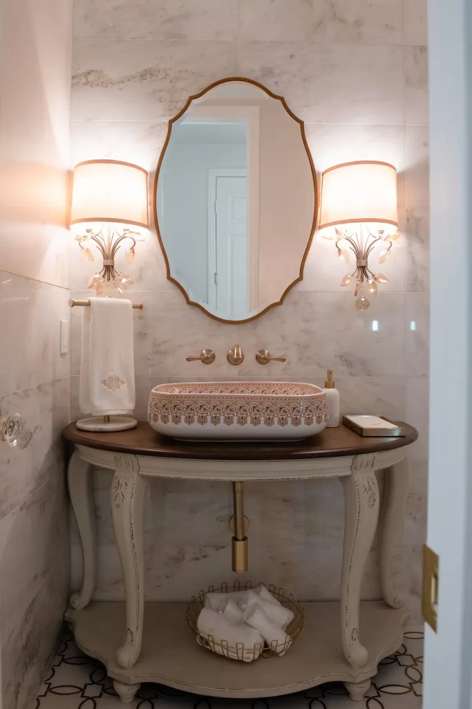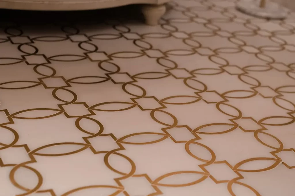 Gold accents are reflected throughout the rest of the remodel, including in the bathroom. One of the guest bathrooms features gold inlaid tyle in an Art Deco style, paired with golden fixtures, sconces, and an angular mirror. Though it matches the rest of the home, this space draws in more elements from the natural world, including floral elements.