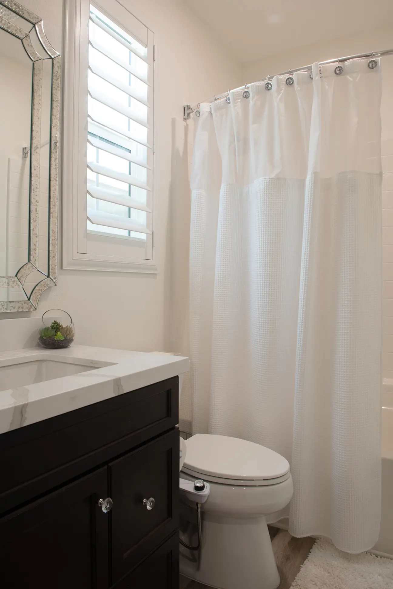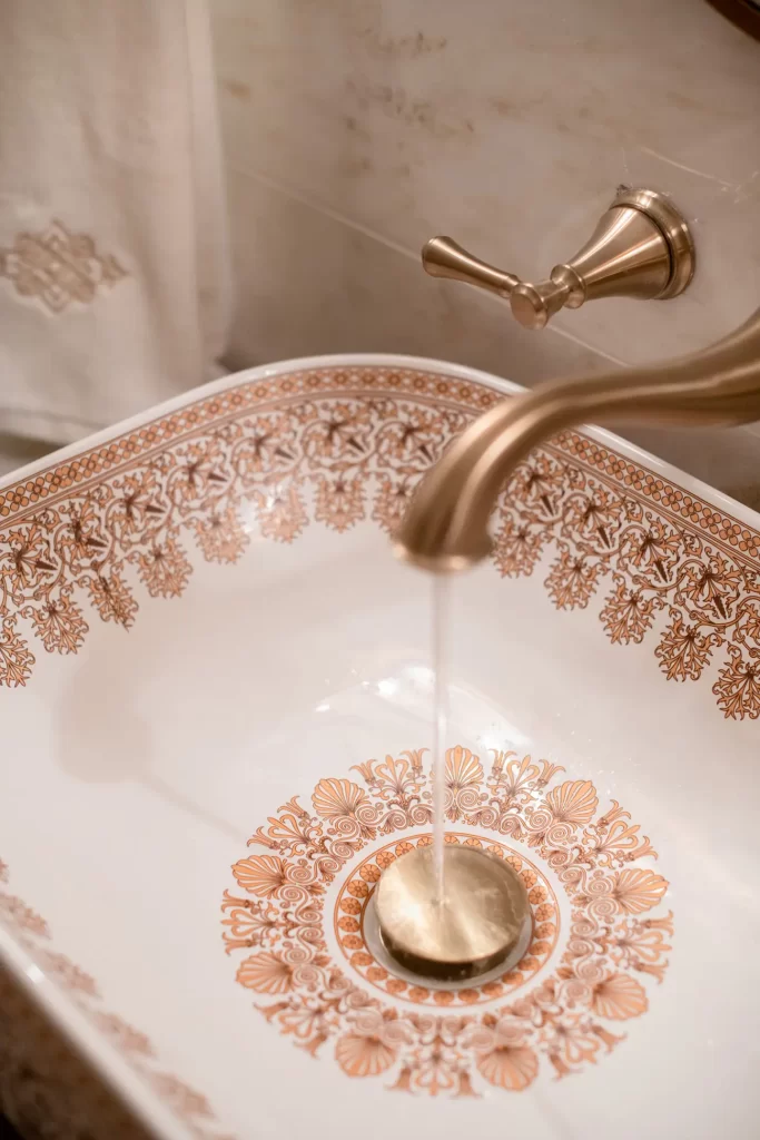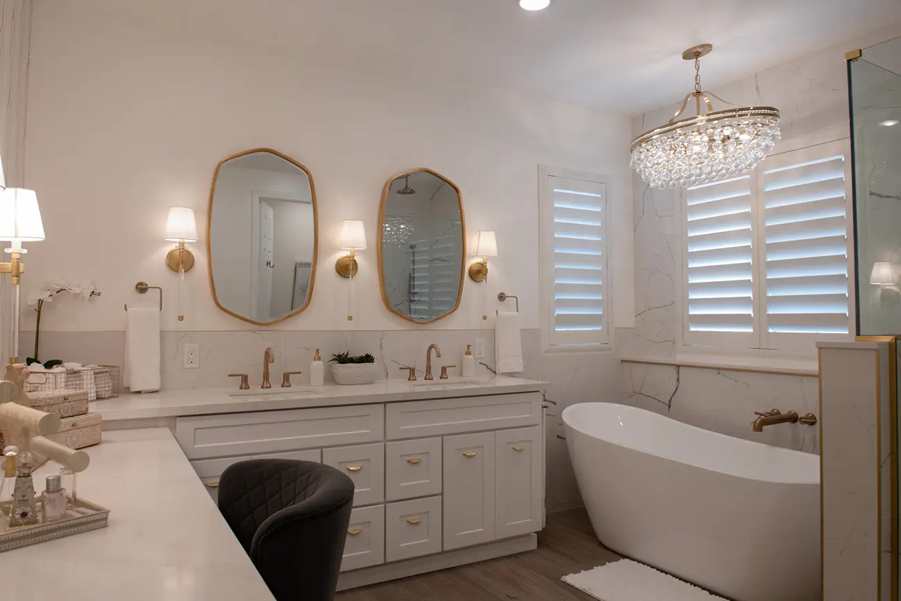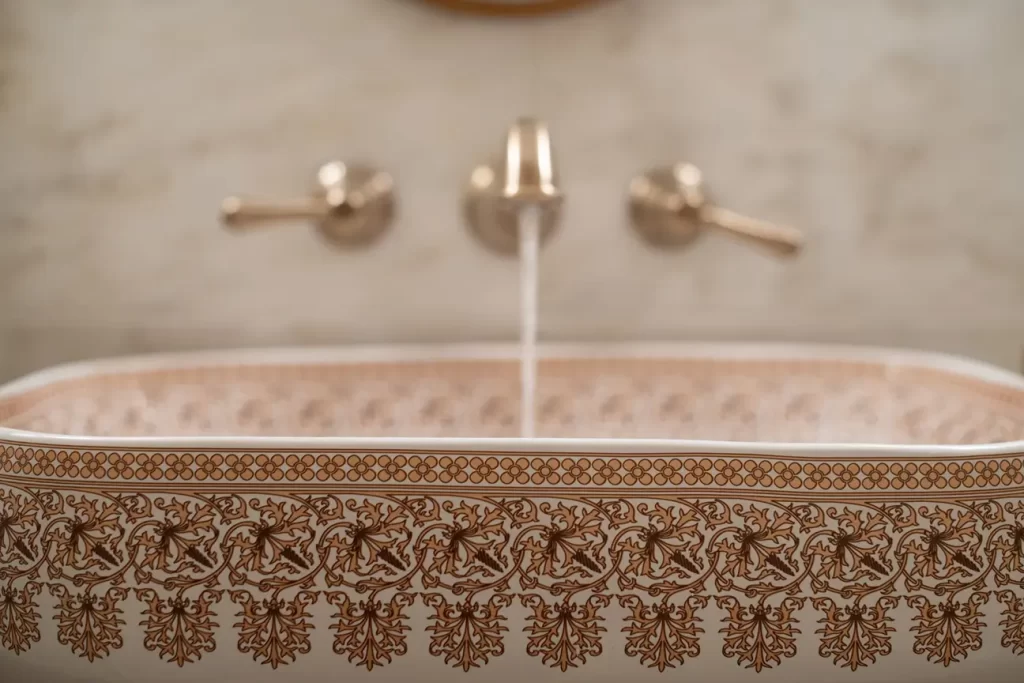 Gold accents are reflected throughout the rest of the remodel, including in the bathroom. One of the guest bathrooms features gold inlaid tyle in an Art Deco style, paired with golden fixtures, sconces, and an angular mirror. Though it matches the rest of the home, this space draws in more elements from the natural world, including floral elements.