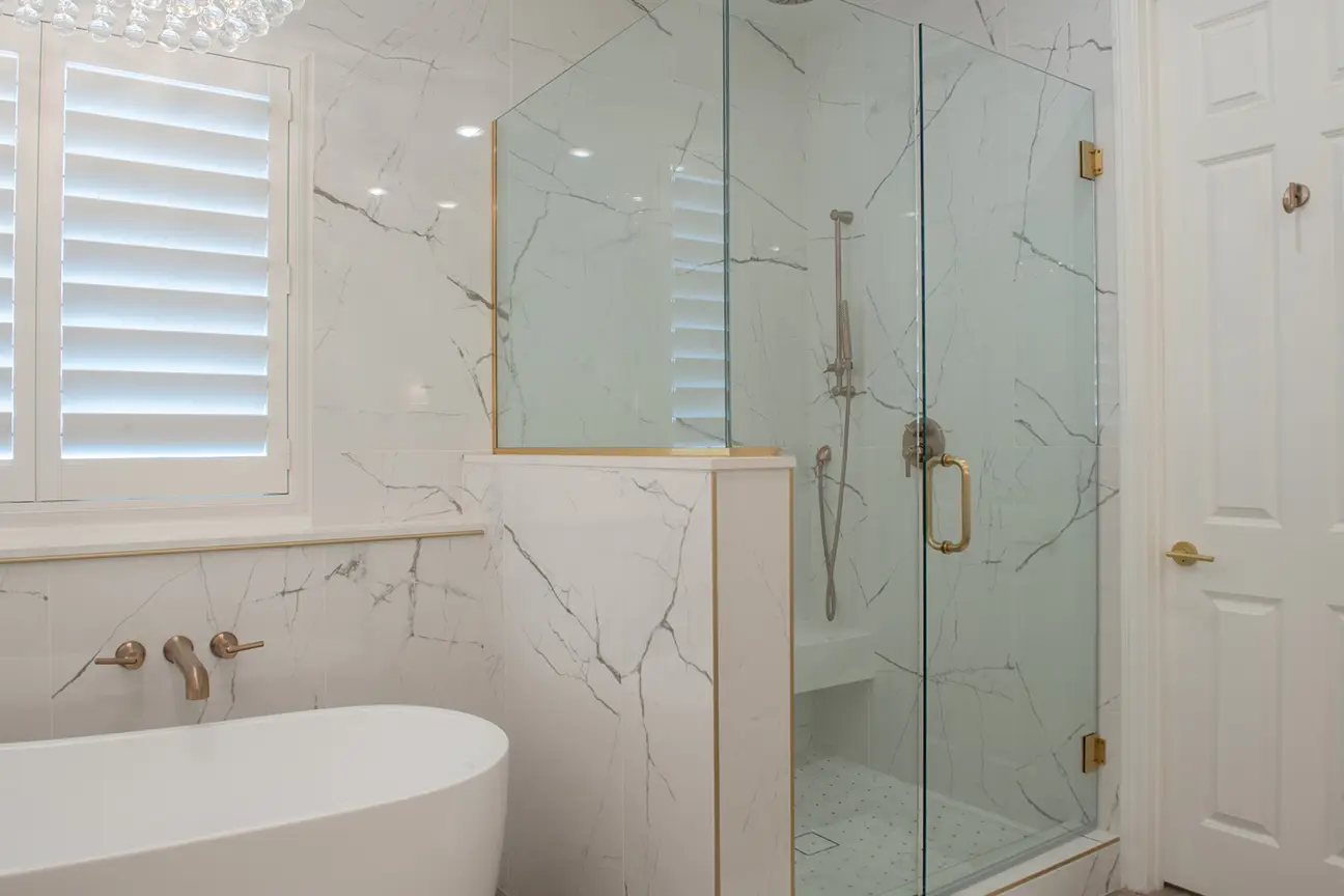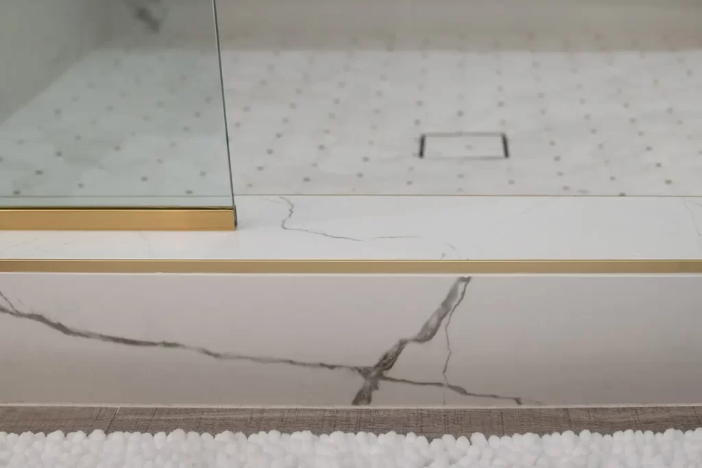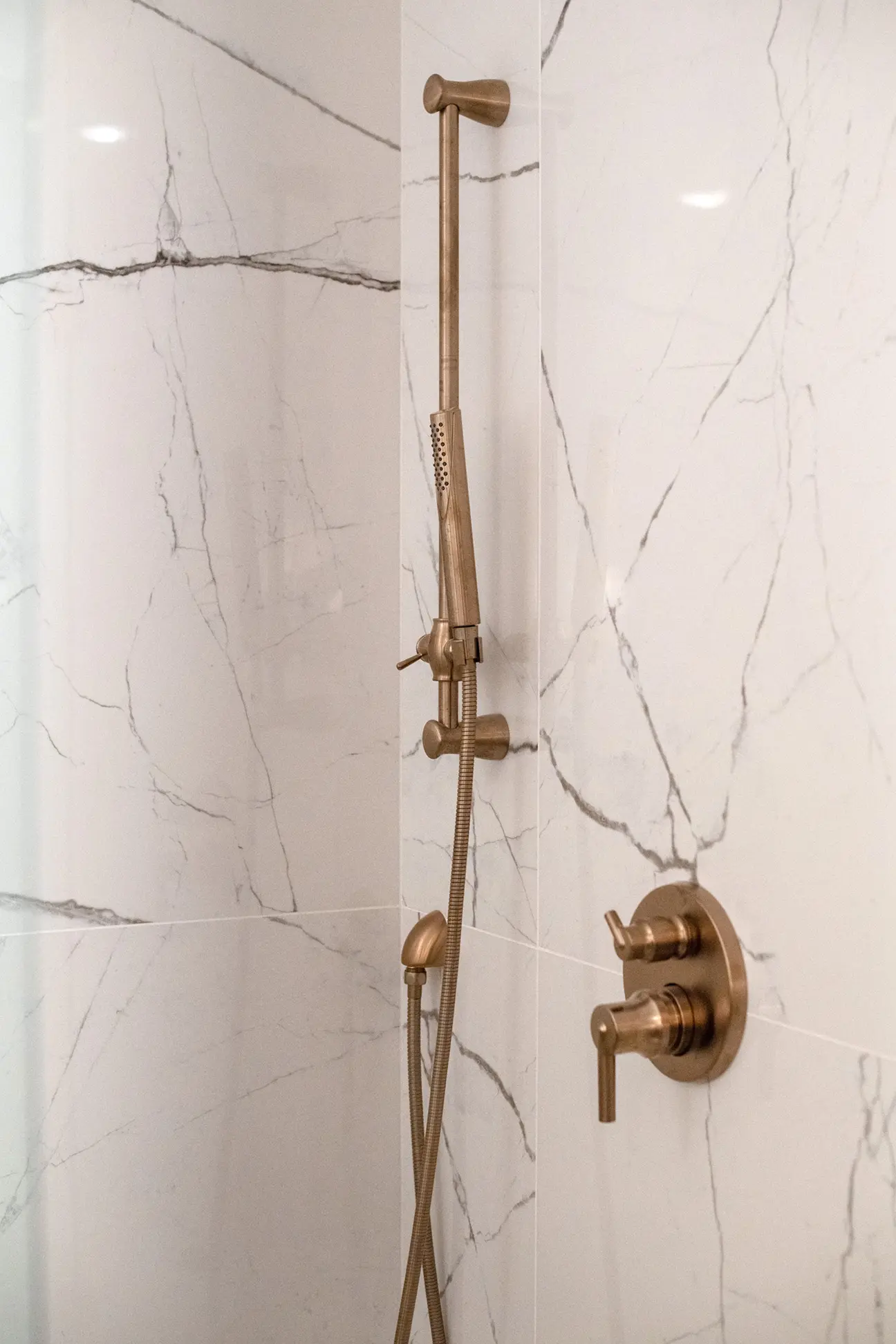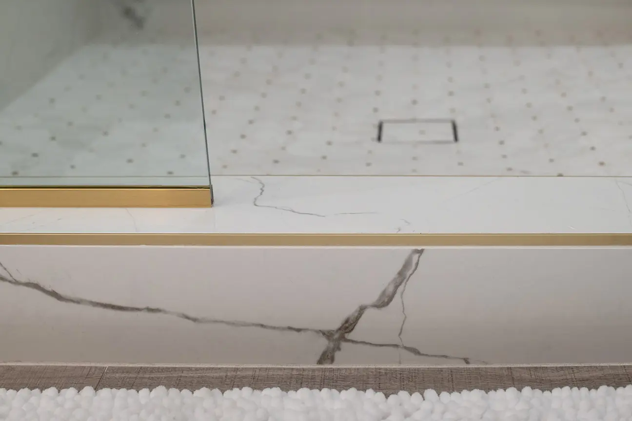 A shower features gold hardware along the glass and between the marble step leading into the space. The shower head, faucet, lights, and mirror also feature the brushed gold finish found in the table and lamps of the living room. They add an element of high class in a space reminiscent of Parisian architecture. Even the wallpaper carries these subtle gold accents to tie the entire look together.