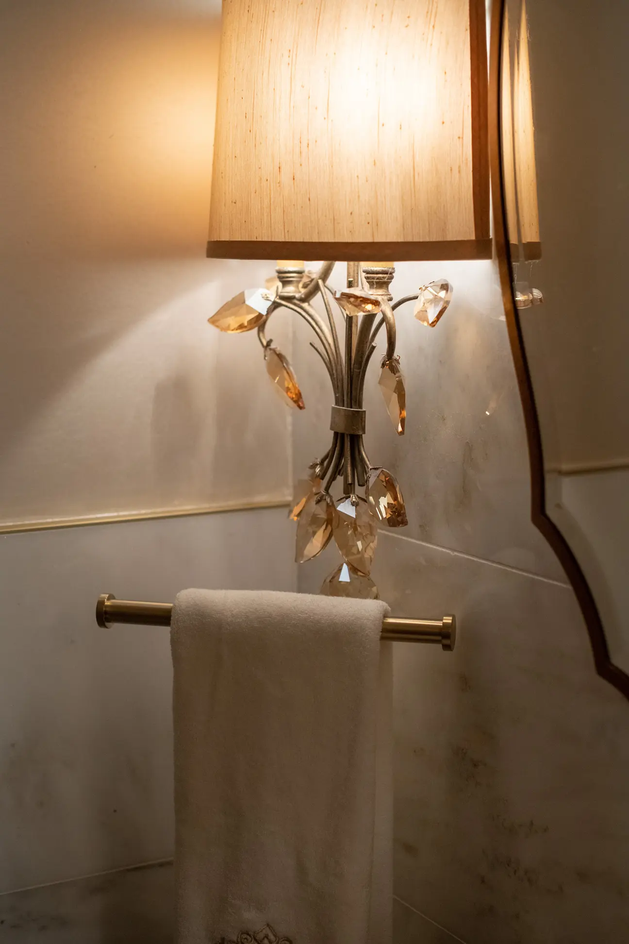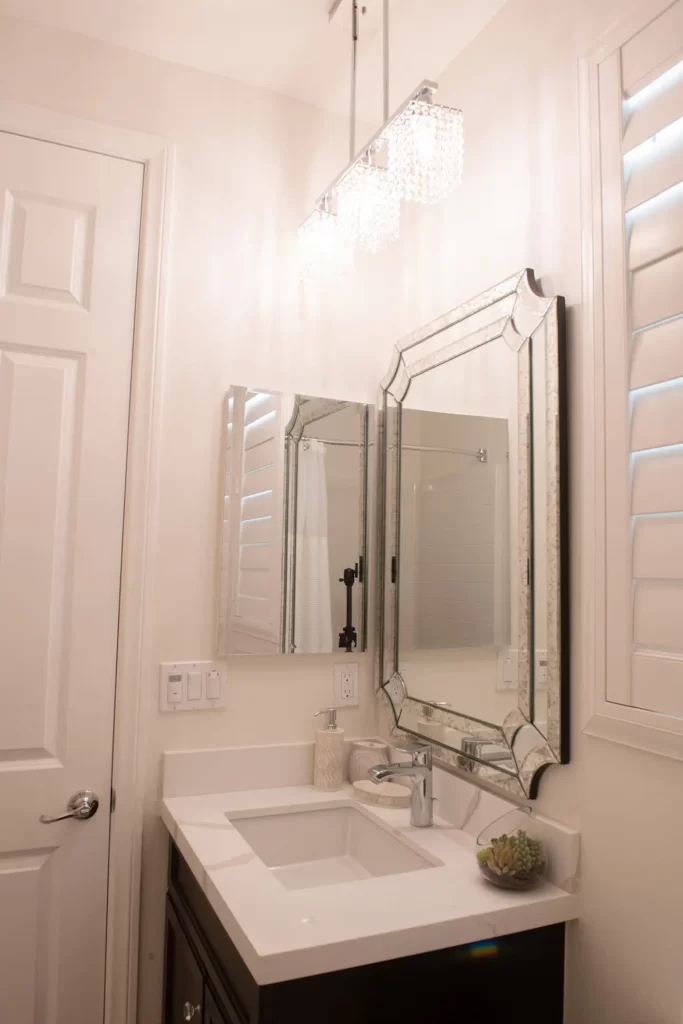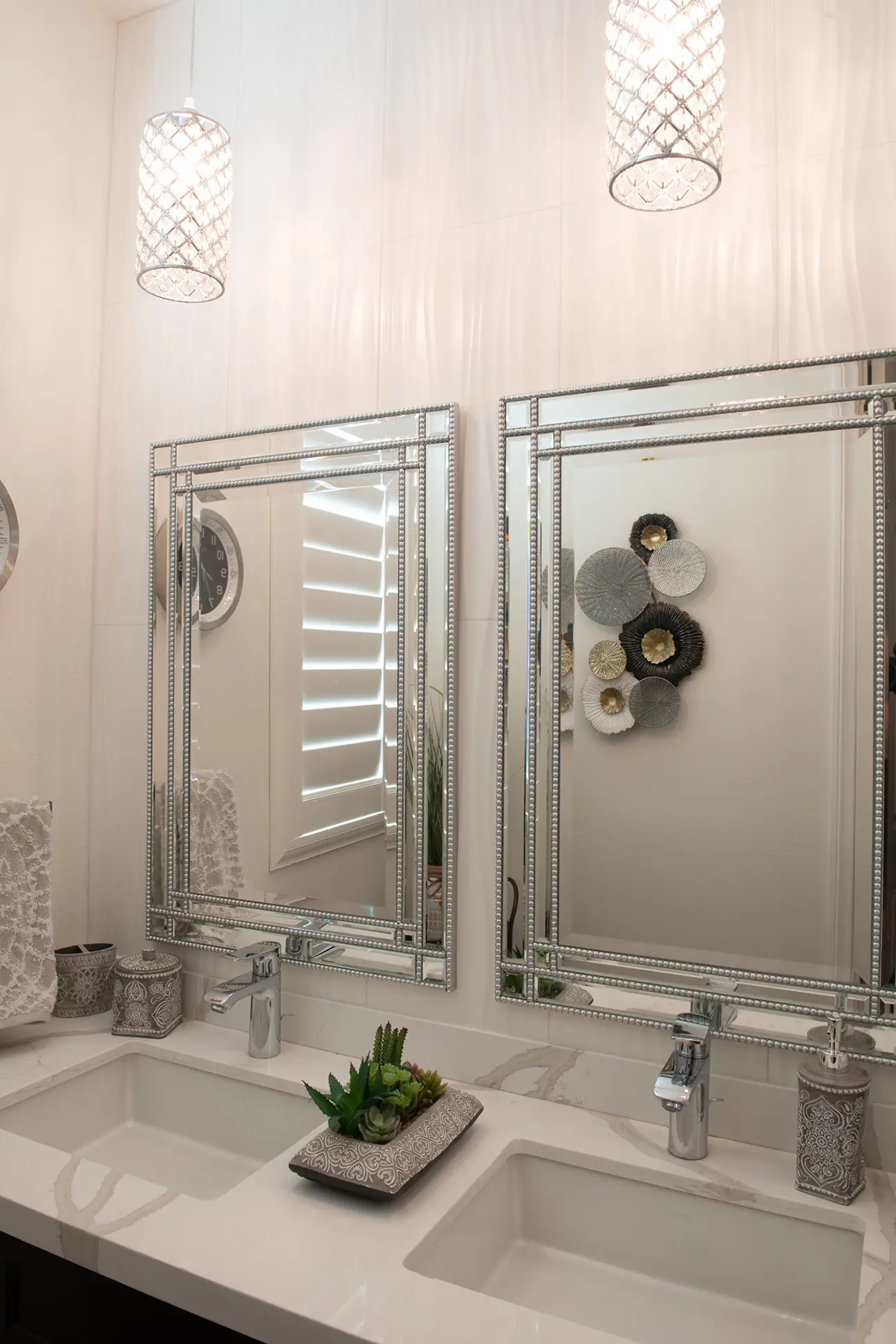 One of the bathrooms here features silver as its main metallic component. Unlike in other spaces, this mirror is more angular, with curved lines that end in sharp cutouts and angles. The