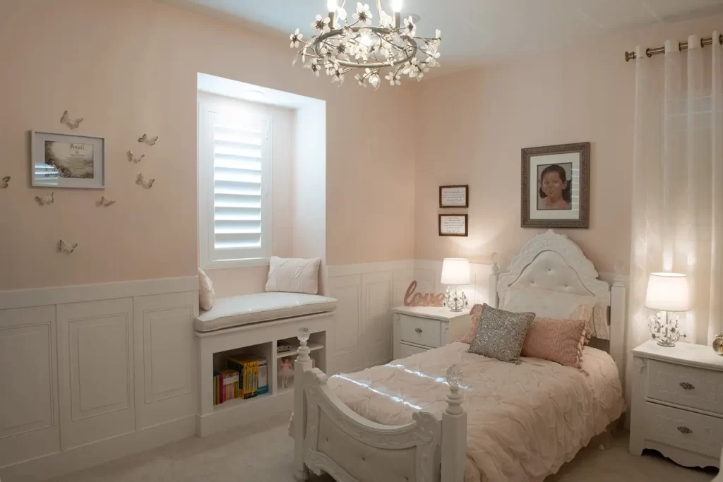 The adjoining bedroom is outfitted for a young girl. Unlike the rest of the home, color is often used here rather than just metallic elements. Peach coats the walls and is found in the pillows, duvet, and other little design features. It also features soft bronze and silver metallic tones.