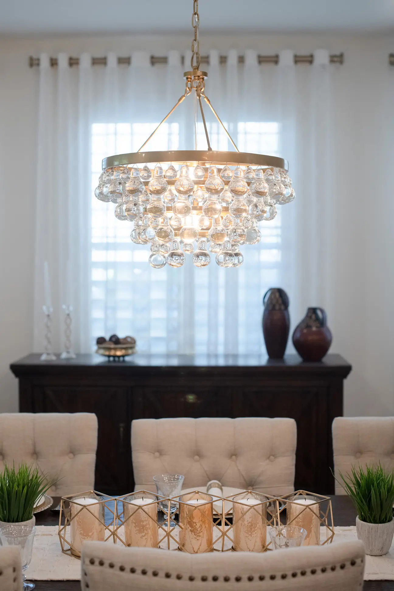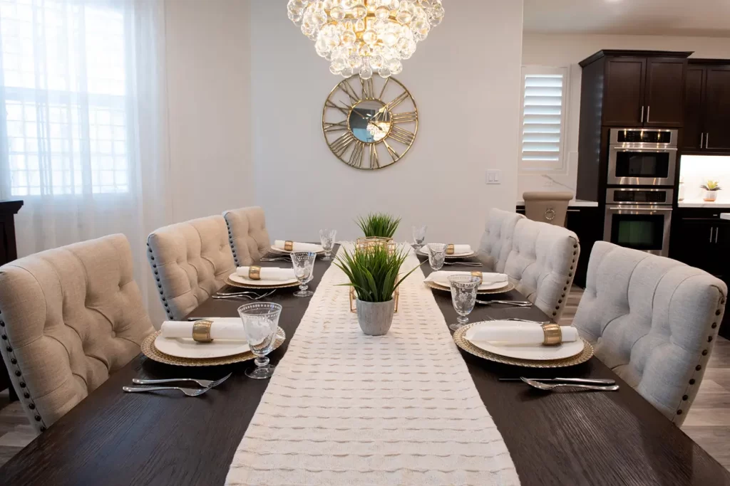 These warm white colors are carried into the other adjoining rooms. A formal dining area features the color on the walls and table runner. Gold is featured again in both the bauble chandelier and the mirrored clock at the head of the space. Golden candle holders also feature, drawing your eye down the table.