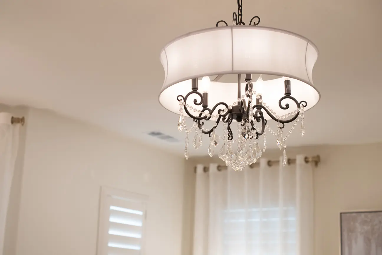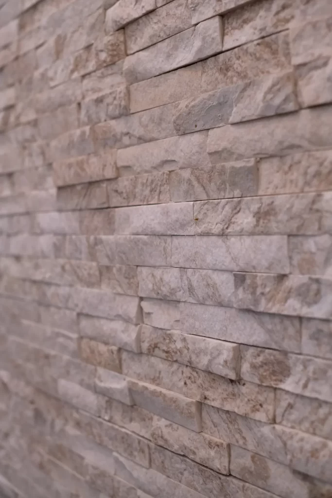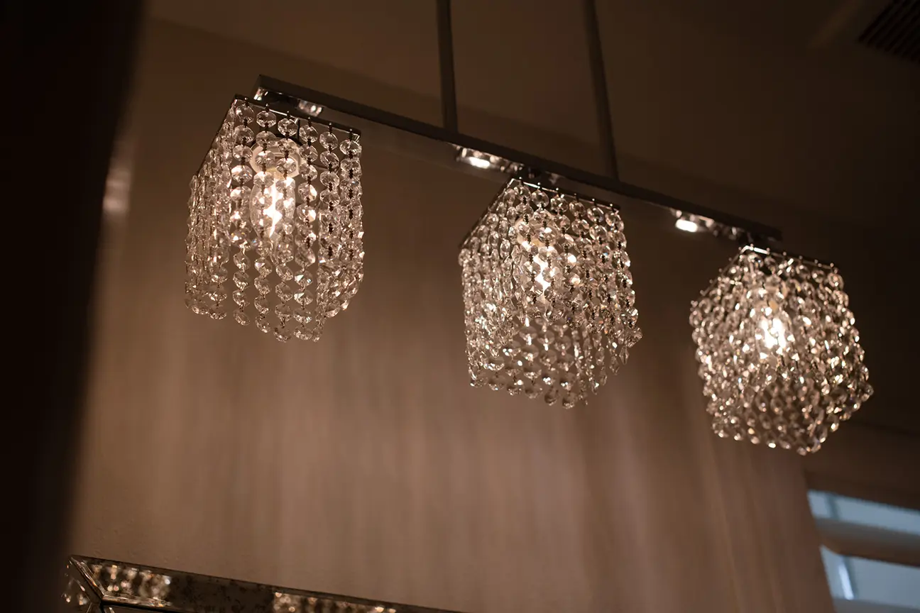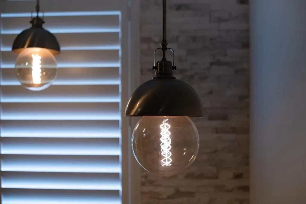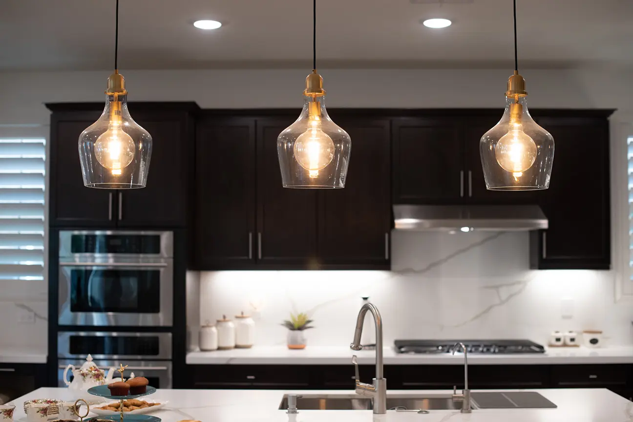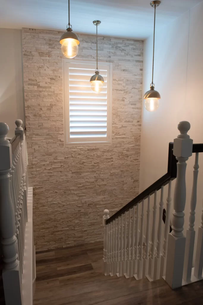 Moving upstairs, the back wall of the stairwell features stone tiles for added texture. Once again, pendant lighting is used, but this time it transitions from the brighter gold tones of downstairs to softer bronze tones.