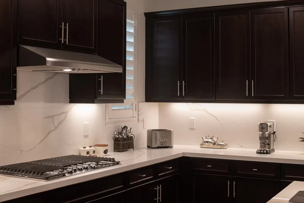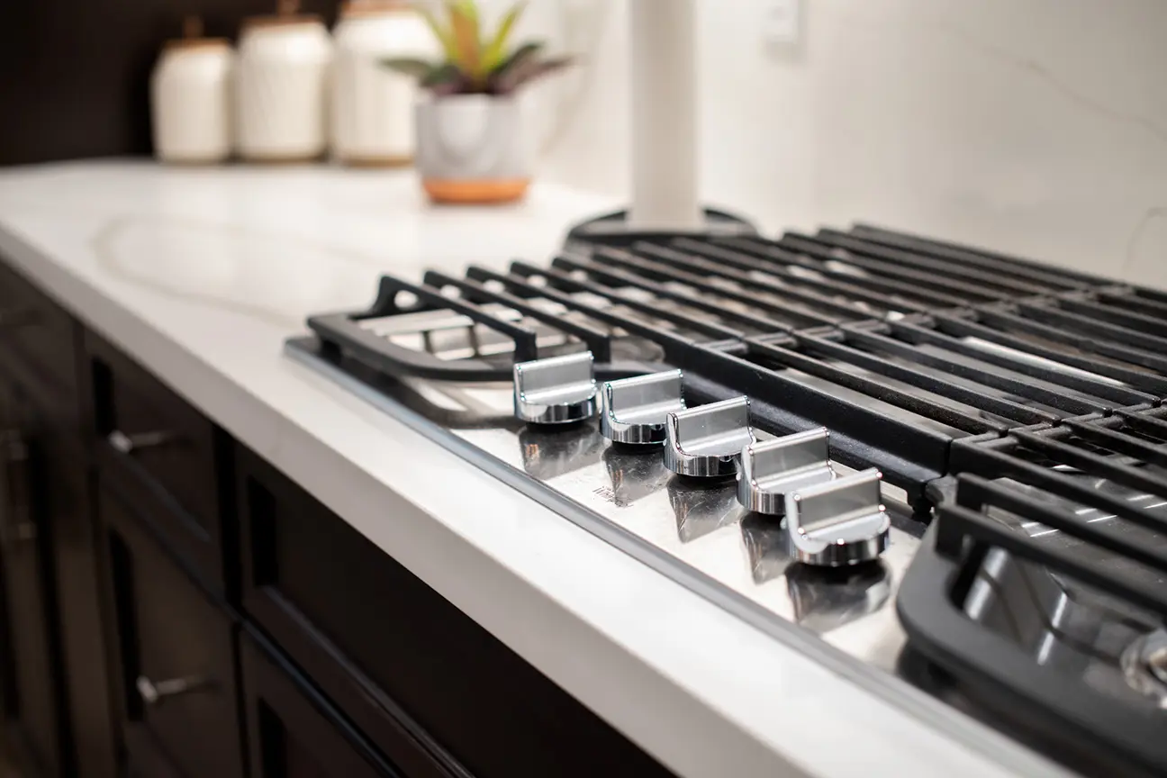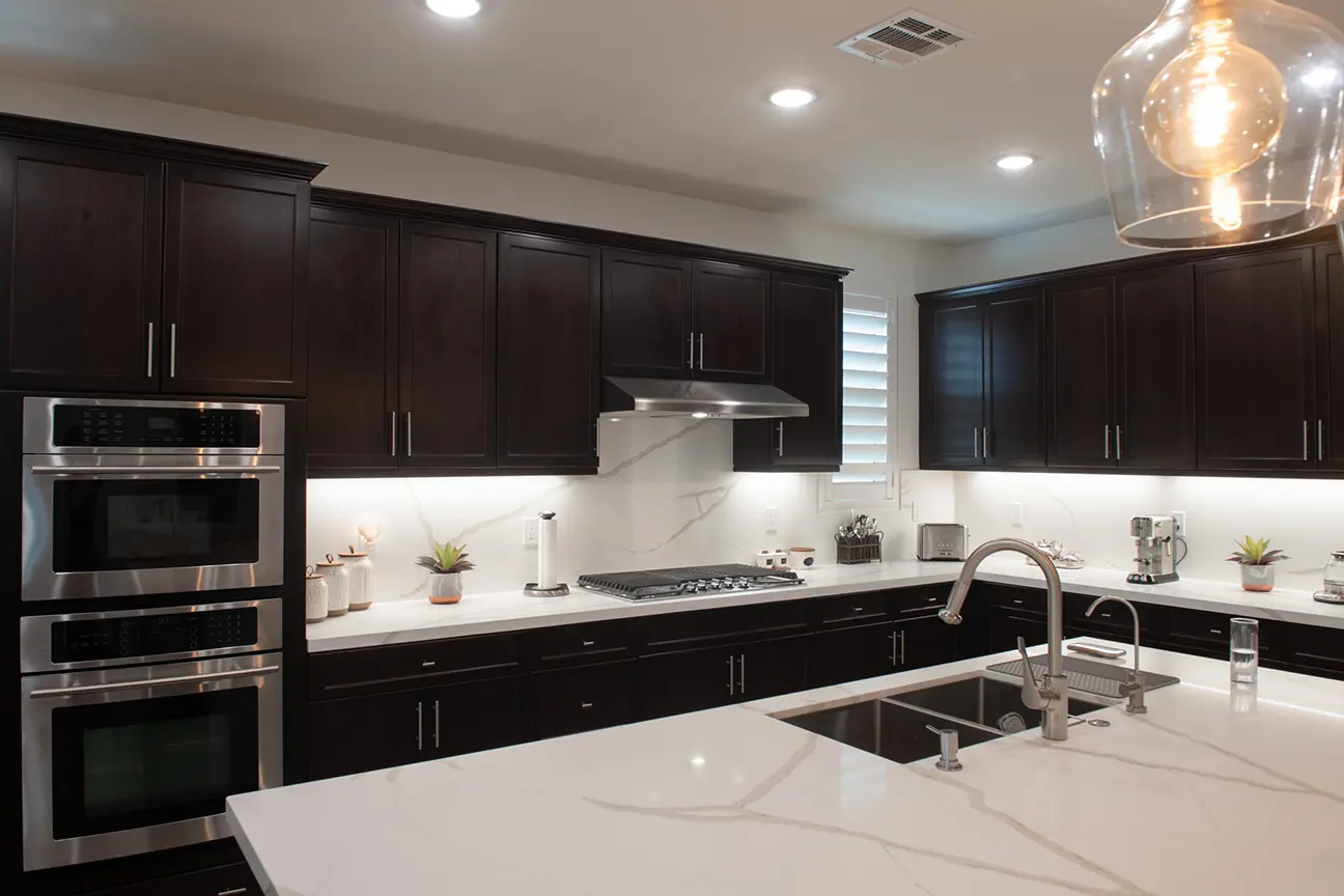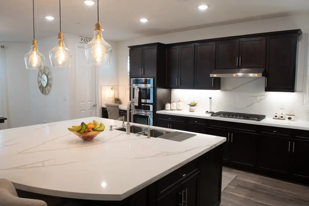 Stepping into the kitchen, the same marble used in one of the guest bathrooms is used here as a backsplash and countertop. Dimension is added through the gray streaks in the marble countertops and backsplash used here. The brushed gold is only found in the pendant lights; everything else has been replaced with a brushed steel look that is more befitting of the kitchen and far easier to clean.