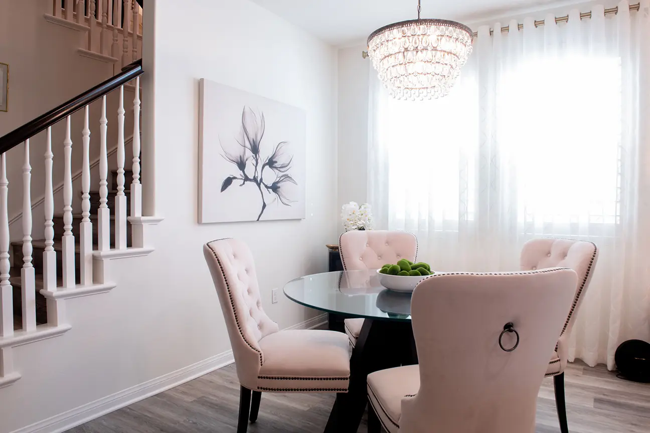 The furniture is a mix of a dark brown table and grey cloth dining chairs, which feature a studded and upholstered look as their counterparts in the living room. A dark brown finish on the table contrasts all the brighter colors in the room, but it also helps tie in the nearby kitchen, which uses dark brown cabinetry.